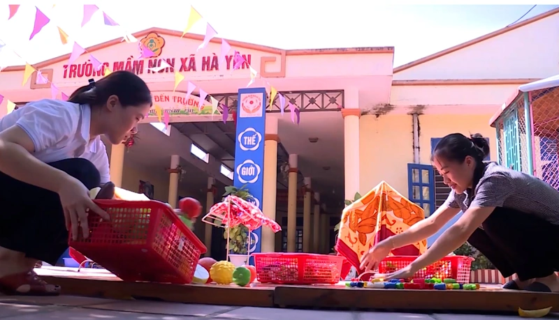 Công tác vệ sinh, khử khuẩn trường, lớp học, đồ dùng bán trú tại Trường Mầm non Hà Yên.