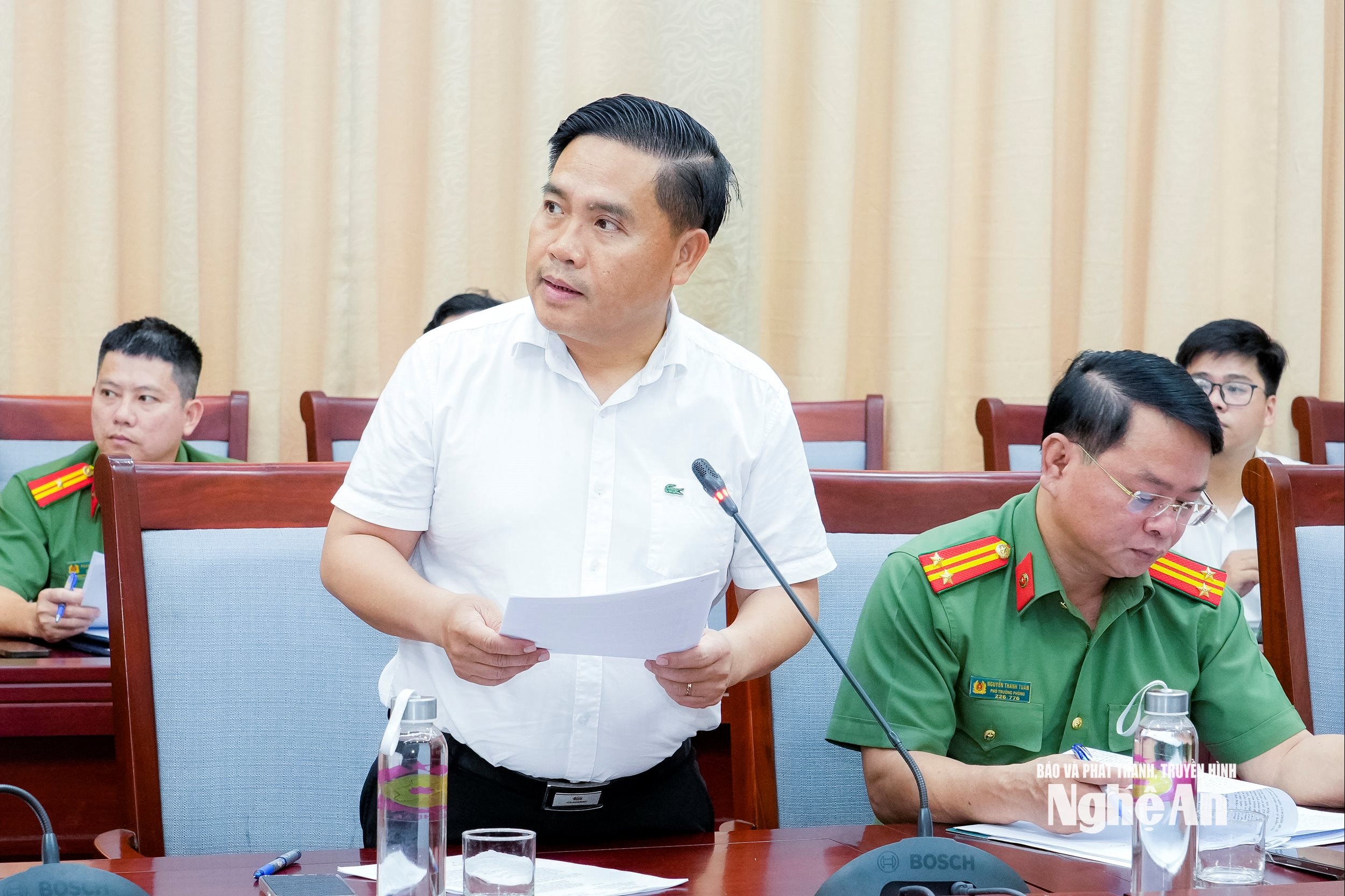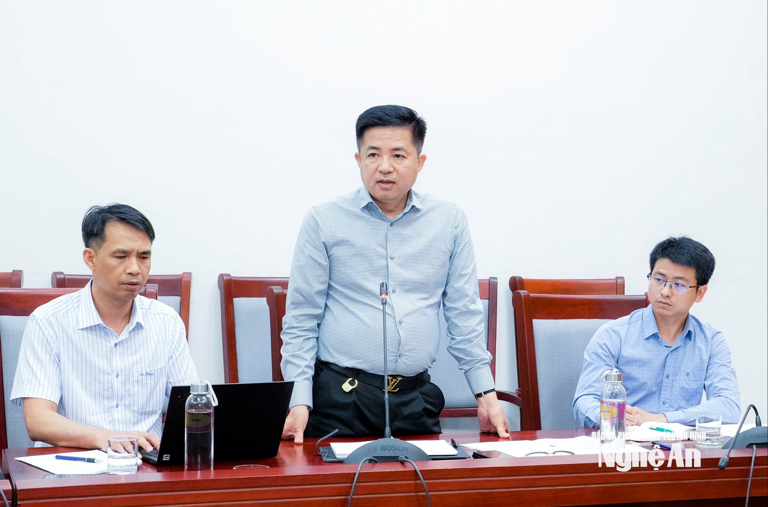 Phó Giám đốc Sở Công Thương Trần Thanh Hải báo cáo tình hình triển khai Dự án Nhà máy Nhiệt điện LNG Quỳnh Lập. Ảnh: Phạm Bằng