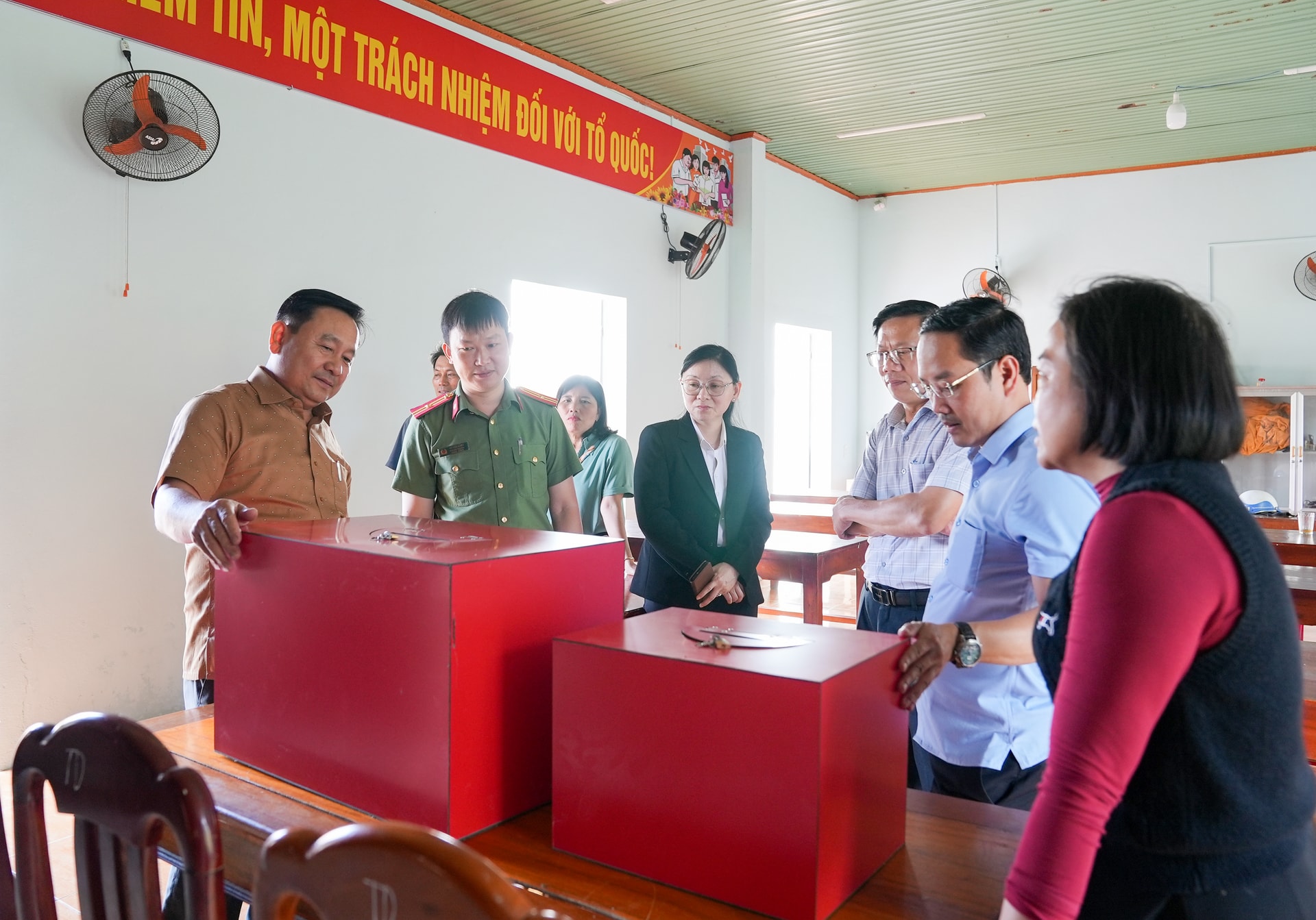 Phó Chủ tịch HĐND thành phố Nguyễn Công Thanh (thứ nhất, bên trái sang) kiểm tra các thùng phiếu tại thôn Tân Phú, xã Tây Hồ. Ảnh: HỒ QUÂN