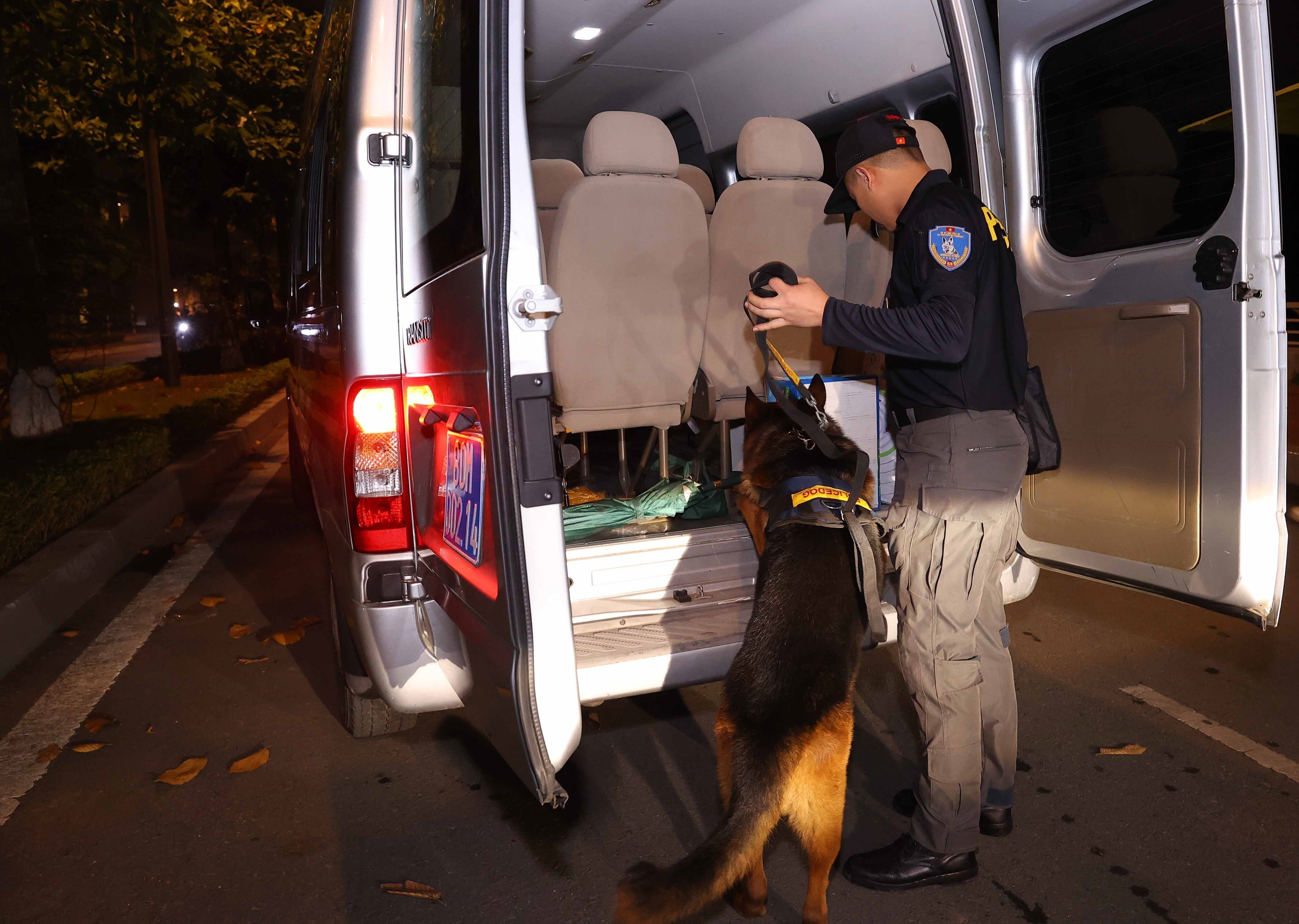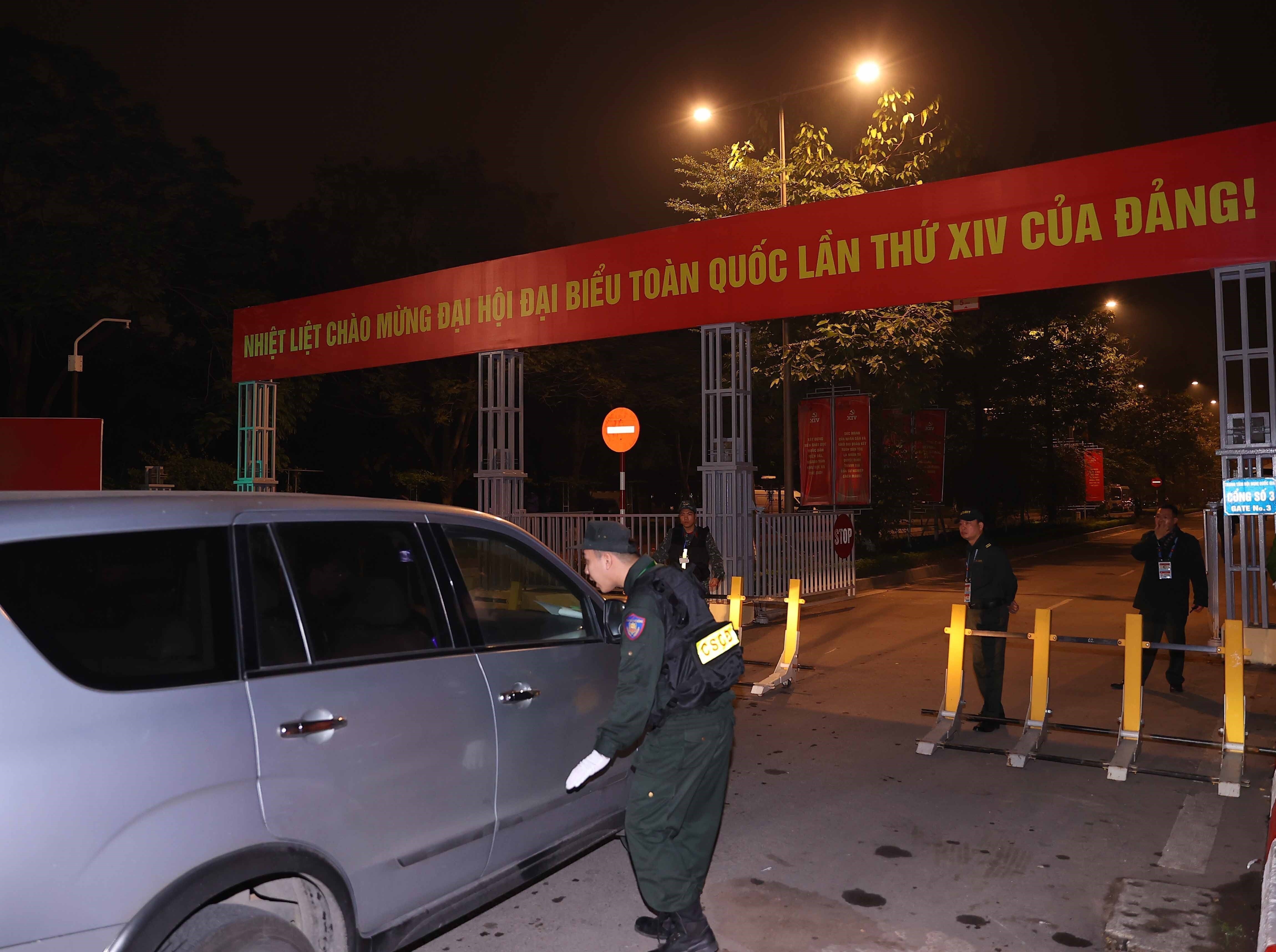Lực lượng an ninh kiểm tra toàn bộ các phương tiện vào Trung tâm Hội nghị Quốc gia. (Ảnh: TTXVN)