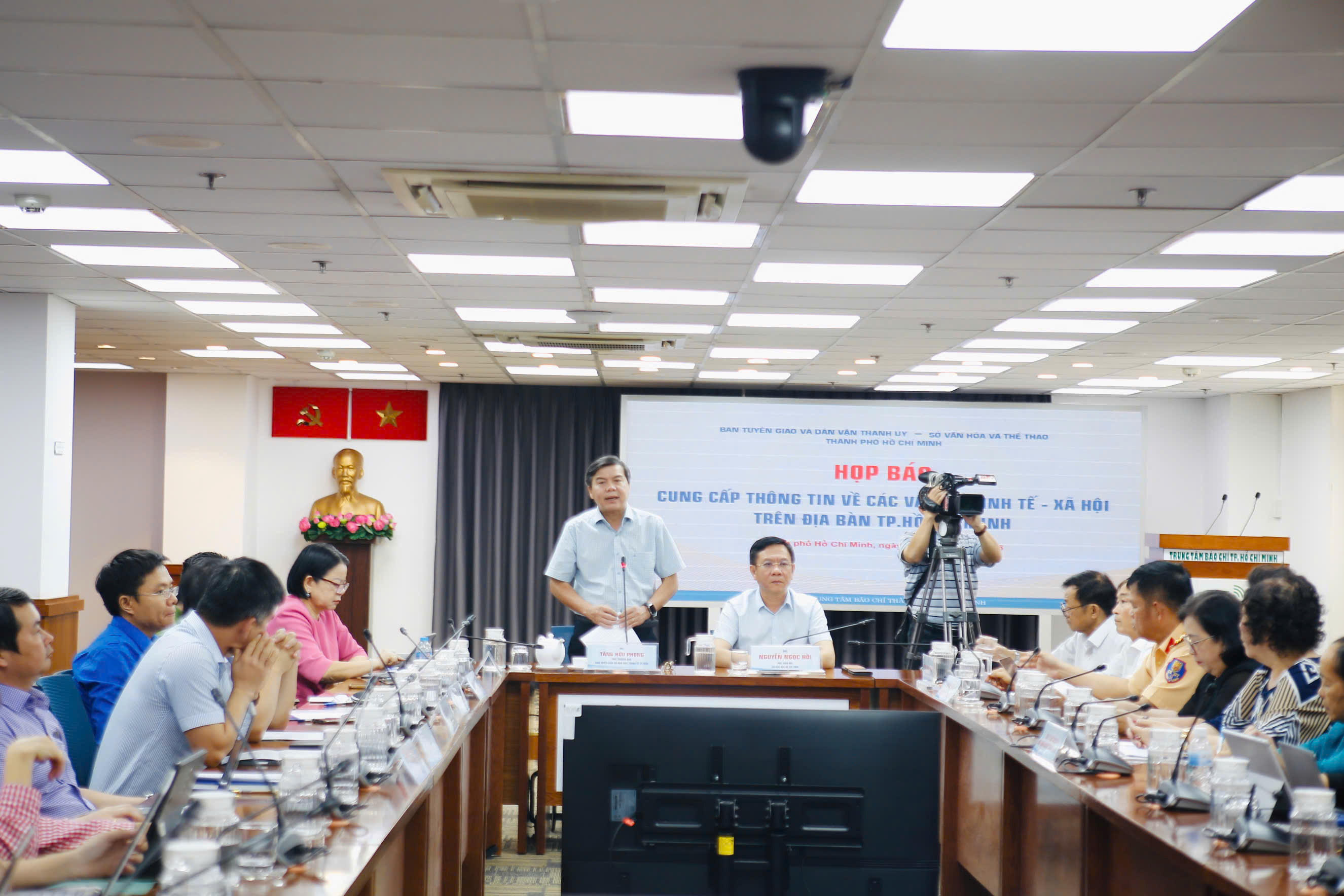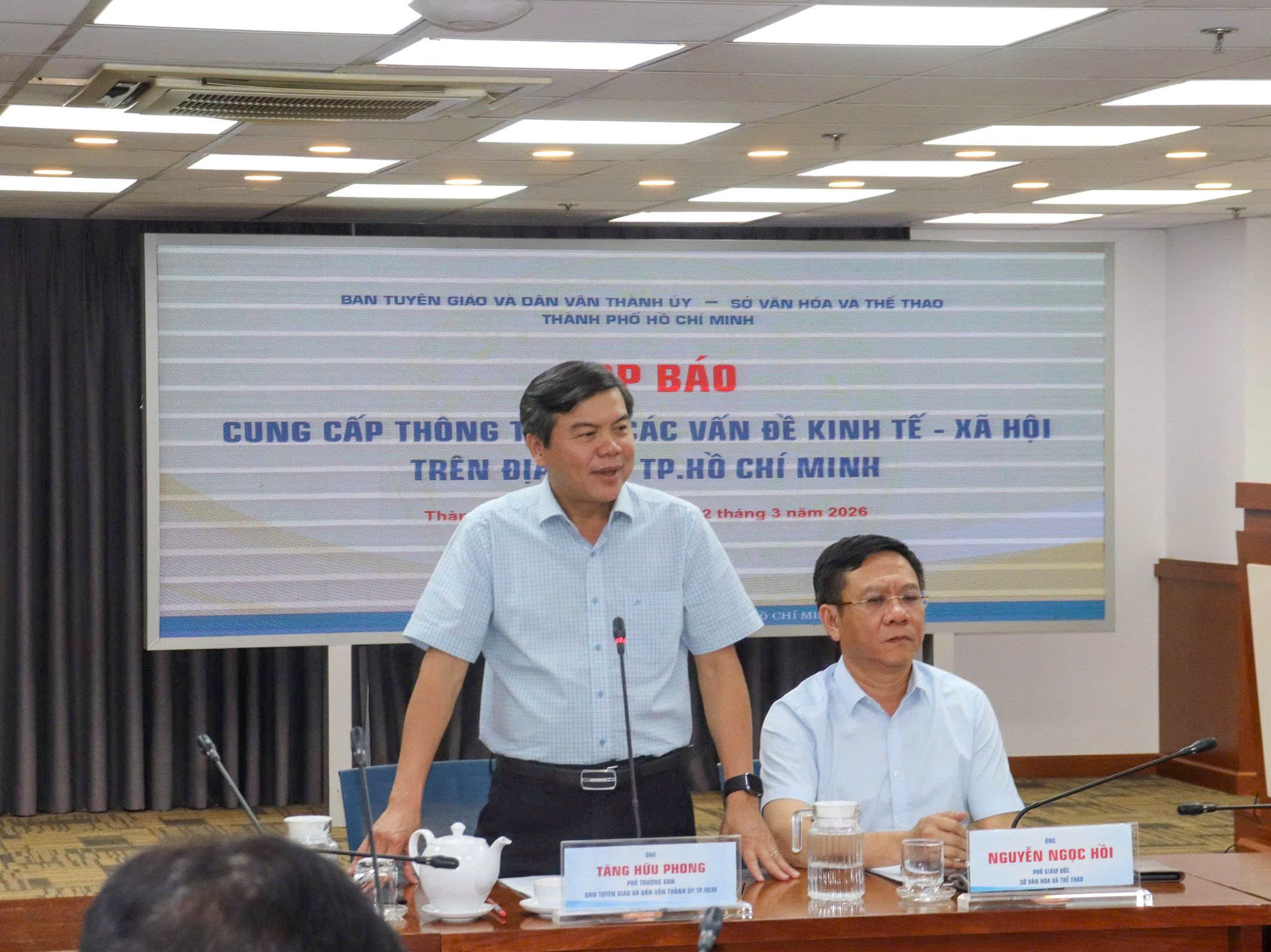 Chủ trì họp báo có các đồng chí: Tăng Hữu Phong, Phó Trưởng Ban Tuyên giáo và Dân vận Thành ủy TPHCM; Nguyễn Ngọc Hồi, Phó Giám đốc Sở VH-TT TPHCM.