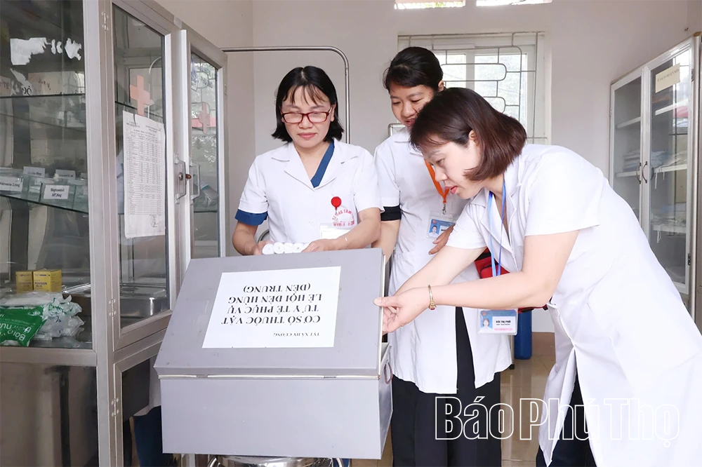 Cán bộ Trạm Y tế xã Hy Cương chuẩn bị thuốc, vật tư, thiết bị y tế sẵn sàng nhiệm vụ trực cấp cứu tại Khu di tích lịch sử Đền Hùng trong những ngày diễn ra lễ hội.