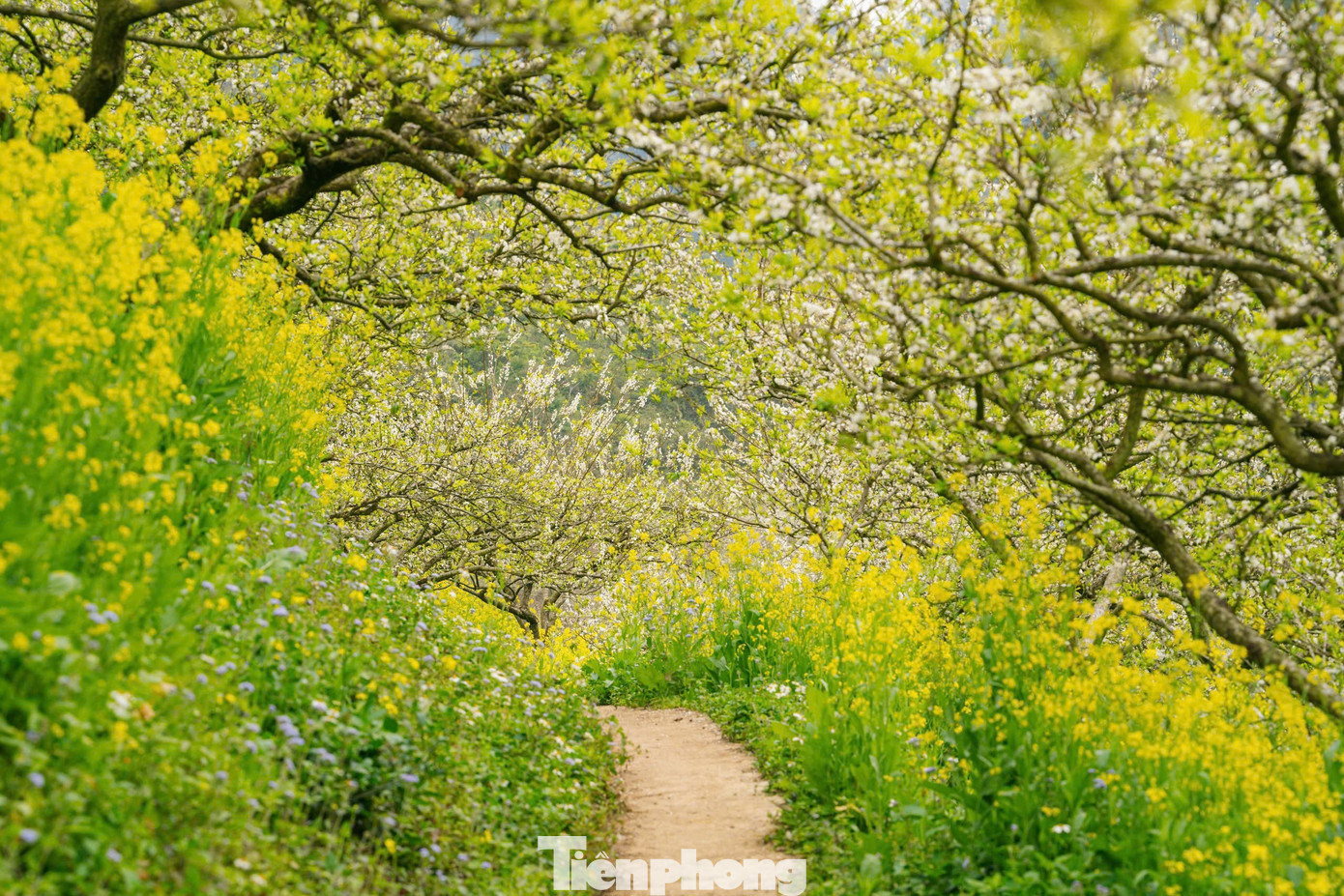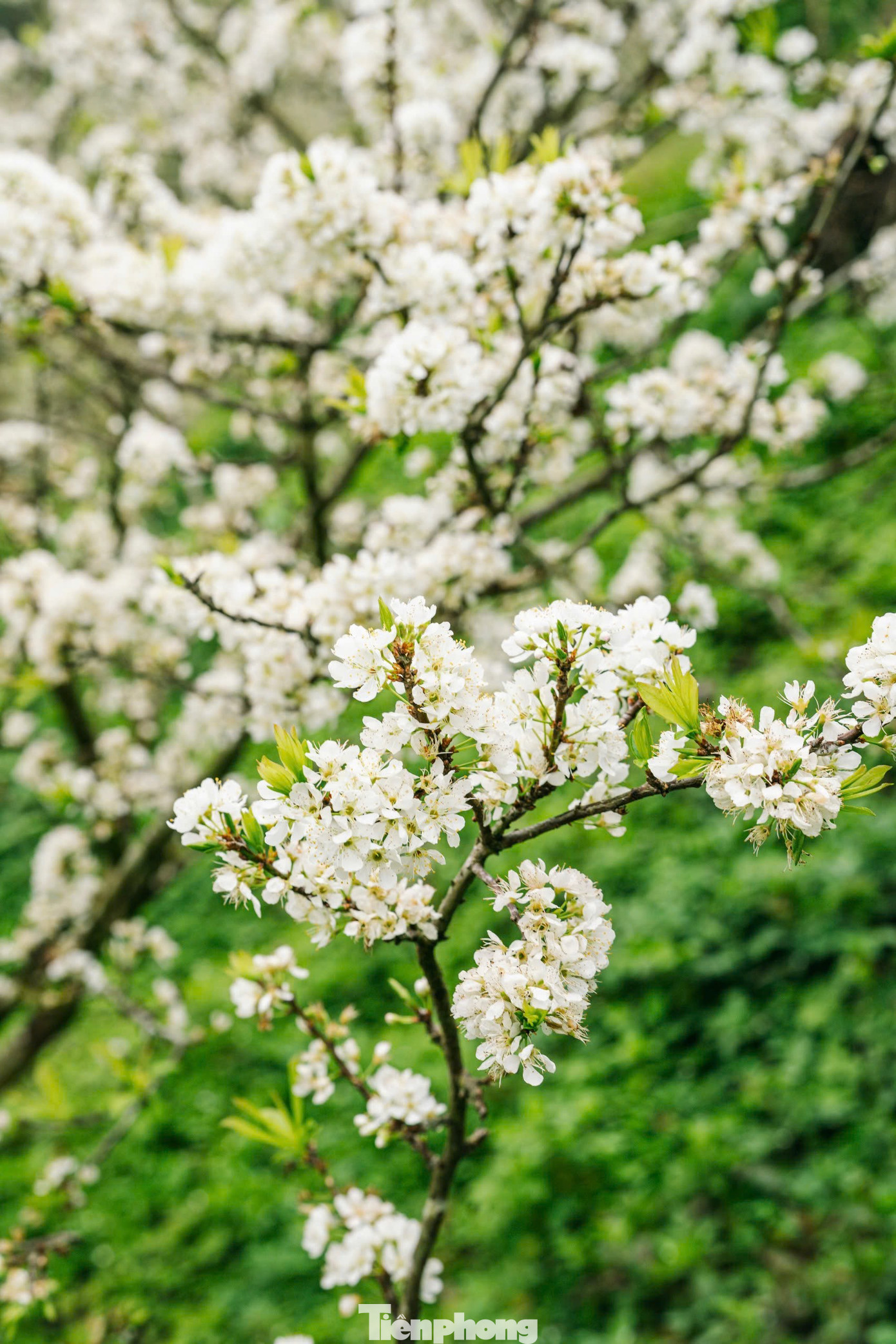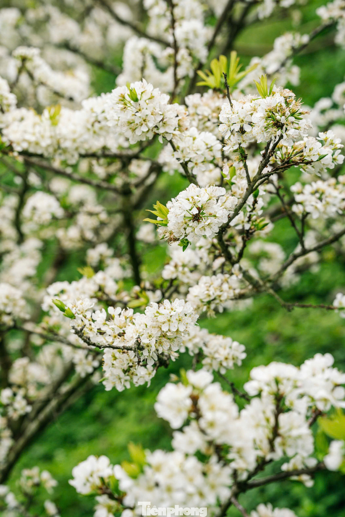 Thăm vườn mận vào buổi sớm, khi sương còn giăng mờ lối nhỏ, hoa mận như được phủ một lớp bạc đẫm sương mai, lấp lánh dưới ánh nắng. Từng cánh hoa mỏng manh rung rinh trong gió, trắng muốt trên nền trời xanh nhạt, hòa cùng màu xanh mướt của hoa đào, hoa cải khiến lòng người chợt chùng lại trước vẻ đẹp mong manh của thiên nhiên.