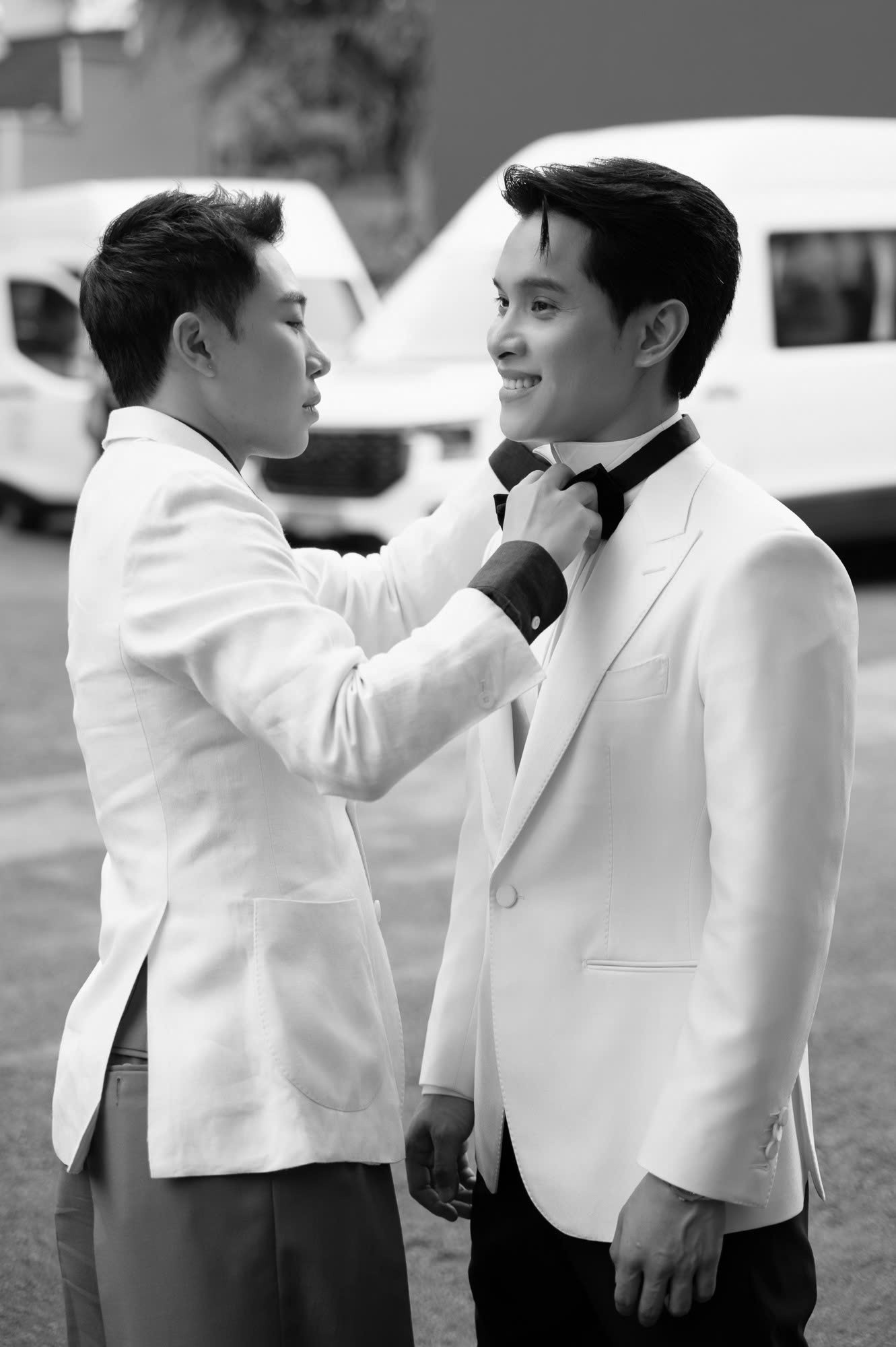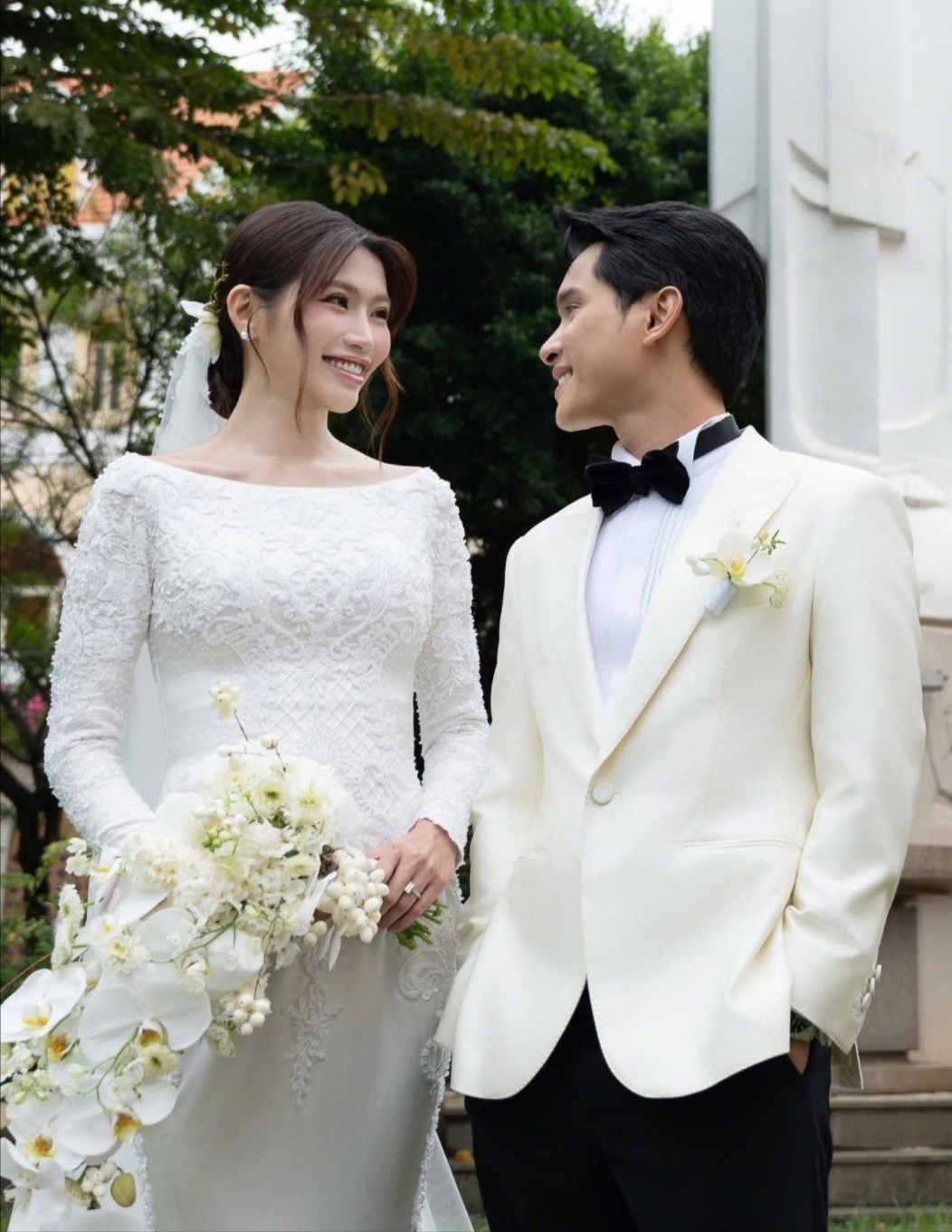 Quỳnh Châu diện váy trắng cổ thuyền, in hoa đơn giản. Cô sử dụng mấn đội đầu cùng tone, trang điểm nhẹ nhàng trong lễ thề nguyện. Doanh nhân Phát Nguyễn mặc ton-sur-ton với cô dâu, chọn nơ đen làm điểm nhấn cho bộ vest trắng.