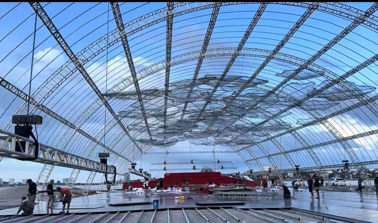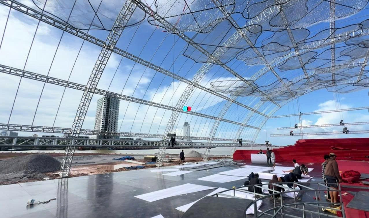 Ngày 17/10, loạt ảnh và video đội thi công gấp rút dựng khung rạp mái vòm tại khu đô thị Nam Cầu Dài, phường Đồng Hới, tỉnh Quảng Trị, hướng nhìn ra sông Nhật Lệ được chia sẻ rầm rộ. Dưới video là hàng loạt hashtag #tapdoansonhai, #hoahaudothiha, #damcuoidothiha...