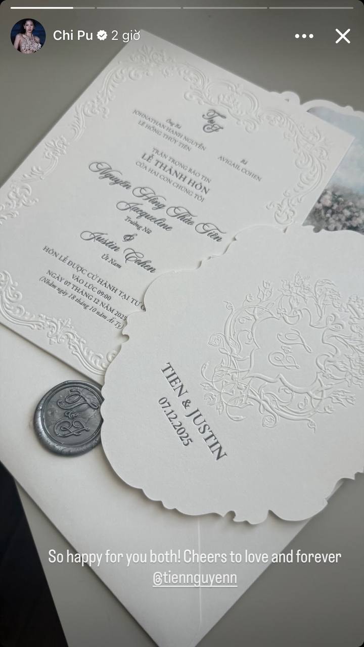 Chi Pu chia sẻ hình ảnh thiệp cưới của Tiên Nguyễn trên mạng xã hội