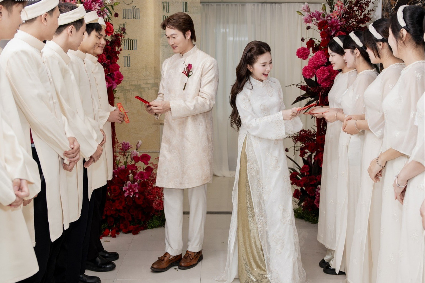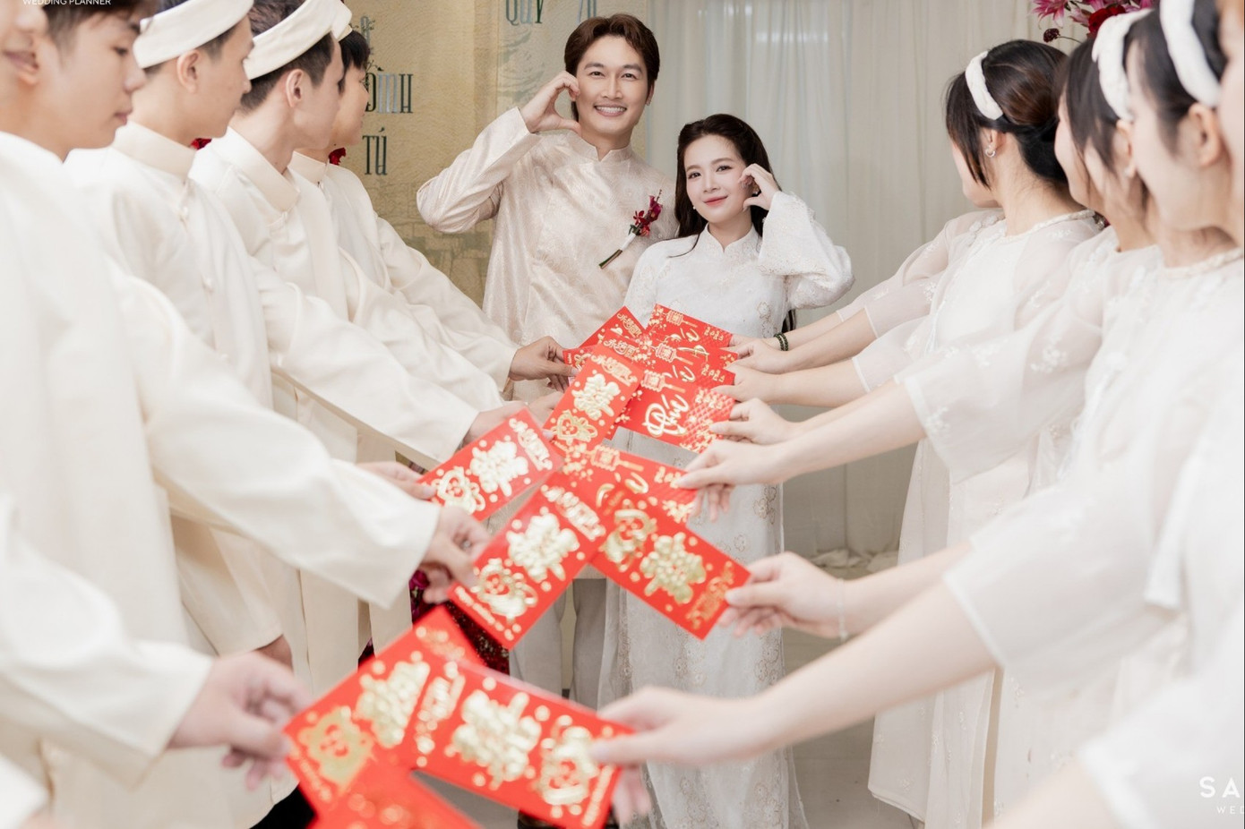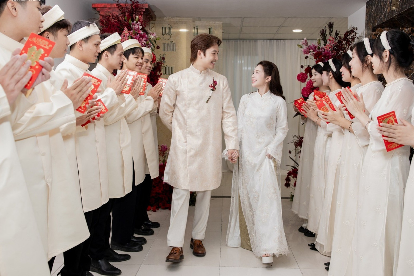 Cả hai mặc áo trắng trang nhã, tổ chức lễ ăn hỏi theo đúng nghi thức truyền thống.