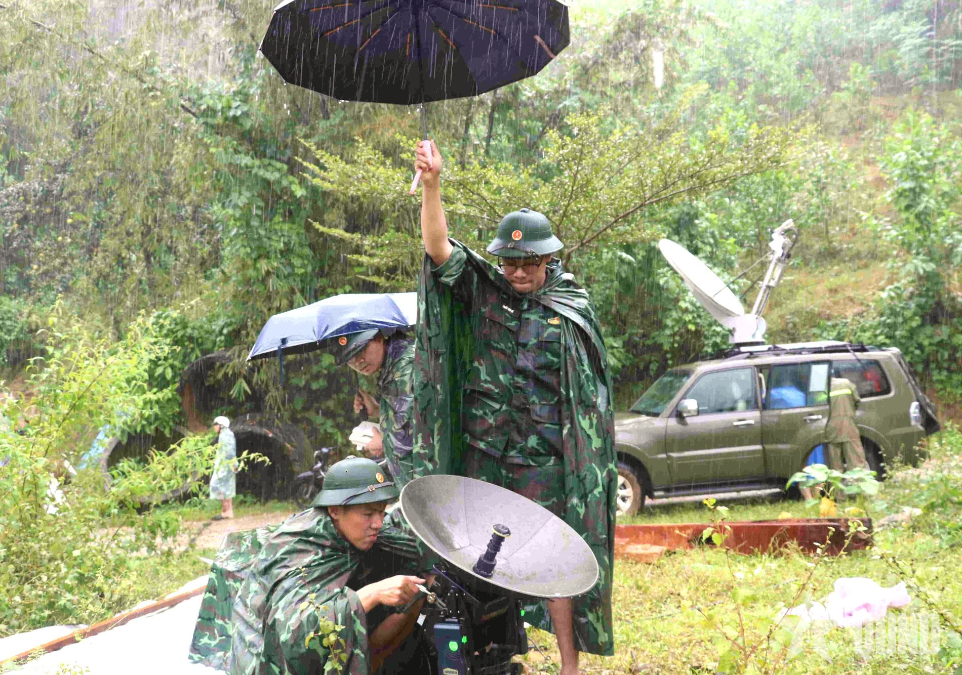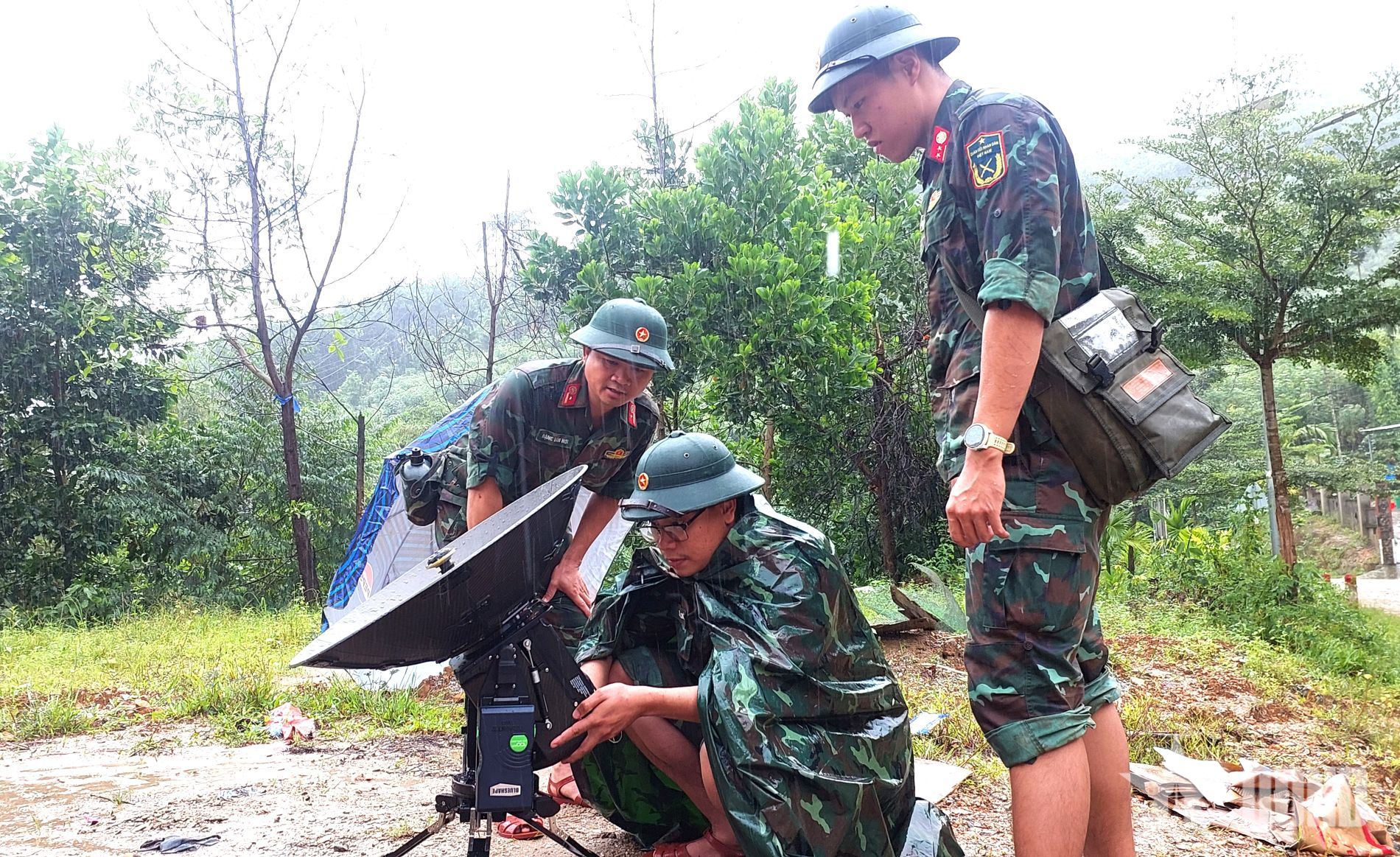 Bất chấp mưa lạnh, gió giật, thiết bị ẩm ướt, sóng bị nhiễu, lính Thông tin vẫn kiên trì, đội mưa, căng mình “bắt” sóng, khôi phục tín hiệu.