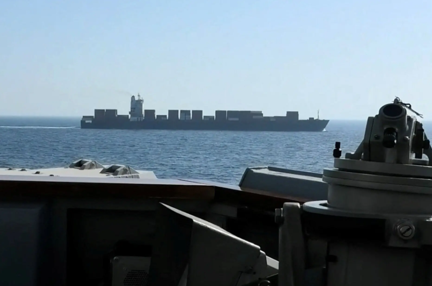 Ảnh chụp màn hình cảnh một tàu khu trục của Hải quân Mỹ đang tiến gần một tàu chở hàng mang cờ Iran trên biển Arab.