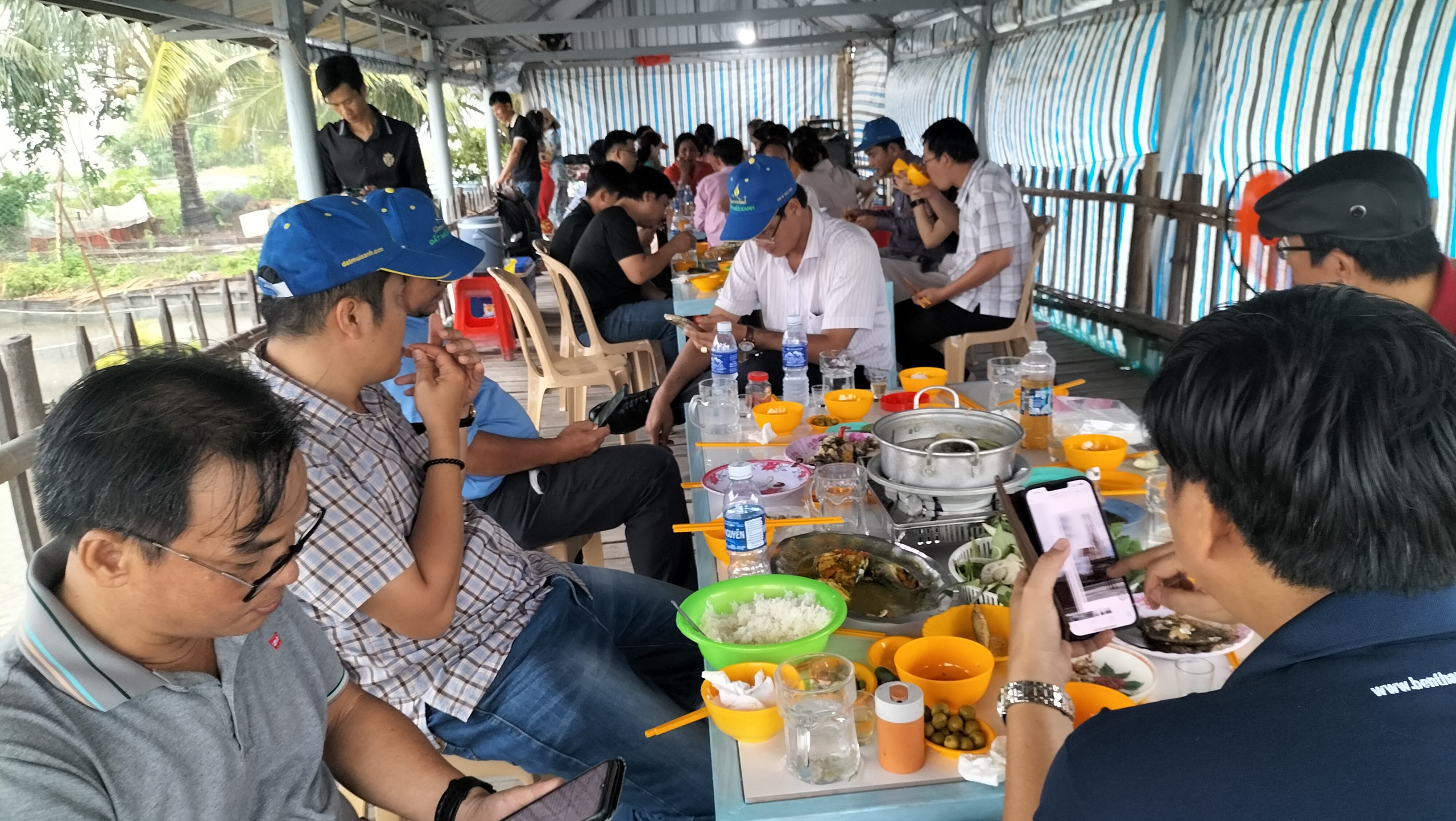 Du khách thưởng thức những món ăn đồng quê, dân dã tại một điểm du lịch cộng đồng quanh Đầm Thị Tường.