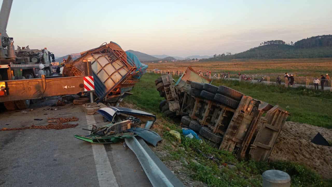 Bất ngờ một ô tô màu trắng loại 16 chỗ cùng một xe đầu kéo lao đến. Cả 2 chiếc xe đã đâm vào các xe dừng phía trước. Trong đó, chiếc xe đầu kéo đâm một xe tải nhẹ chở lợn giống khiến chiếc xe này rơi vào tình trạng bị dồn toa, bẹp dúm. Chiếc xe đầu kéo sau đó húc bay hộ lan rồi lật xuống vệ đường.