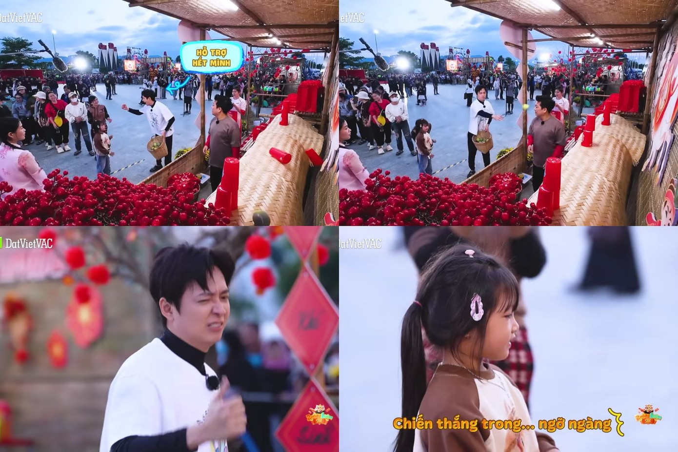 Trong đó, những khoảnh khắc nhỏ nhưng ấm lòng của dàn cast được camera "zoom cận" khiến netizen thêm yêu mến. Ở trò chơi ném ly, Trường Giang "nóng ruột" đứng chờ đợi bà con ném trúng những chiếc ly để "đánh bay vi khuẩn - rước lộc về nhà".