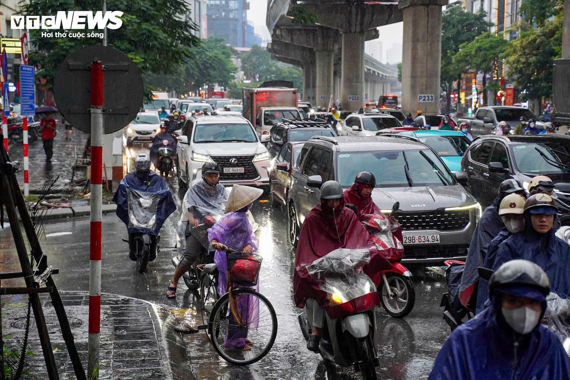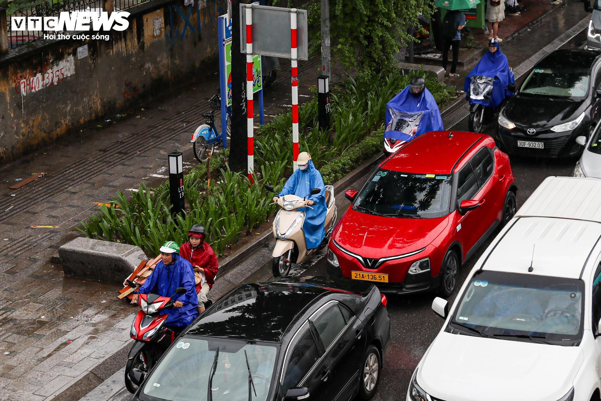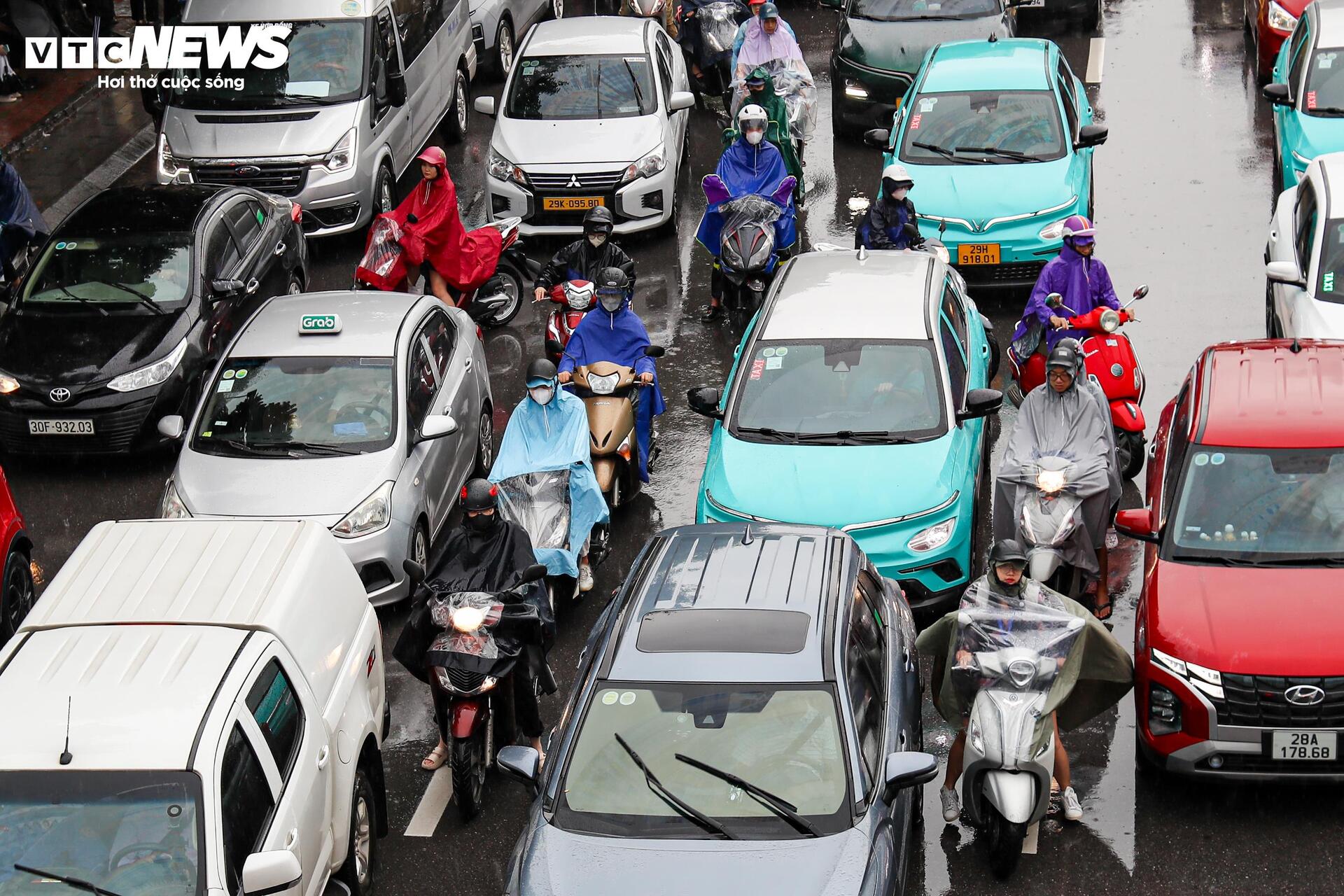 Cùng thời điểm, tại phố Chùa Hà, mưa lớn và mật độ phương tiện dày đặc khiến giao thông gần như tê liệt, các xe phải nhích từng chút để di chuyển.