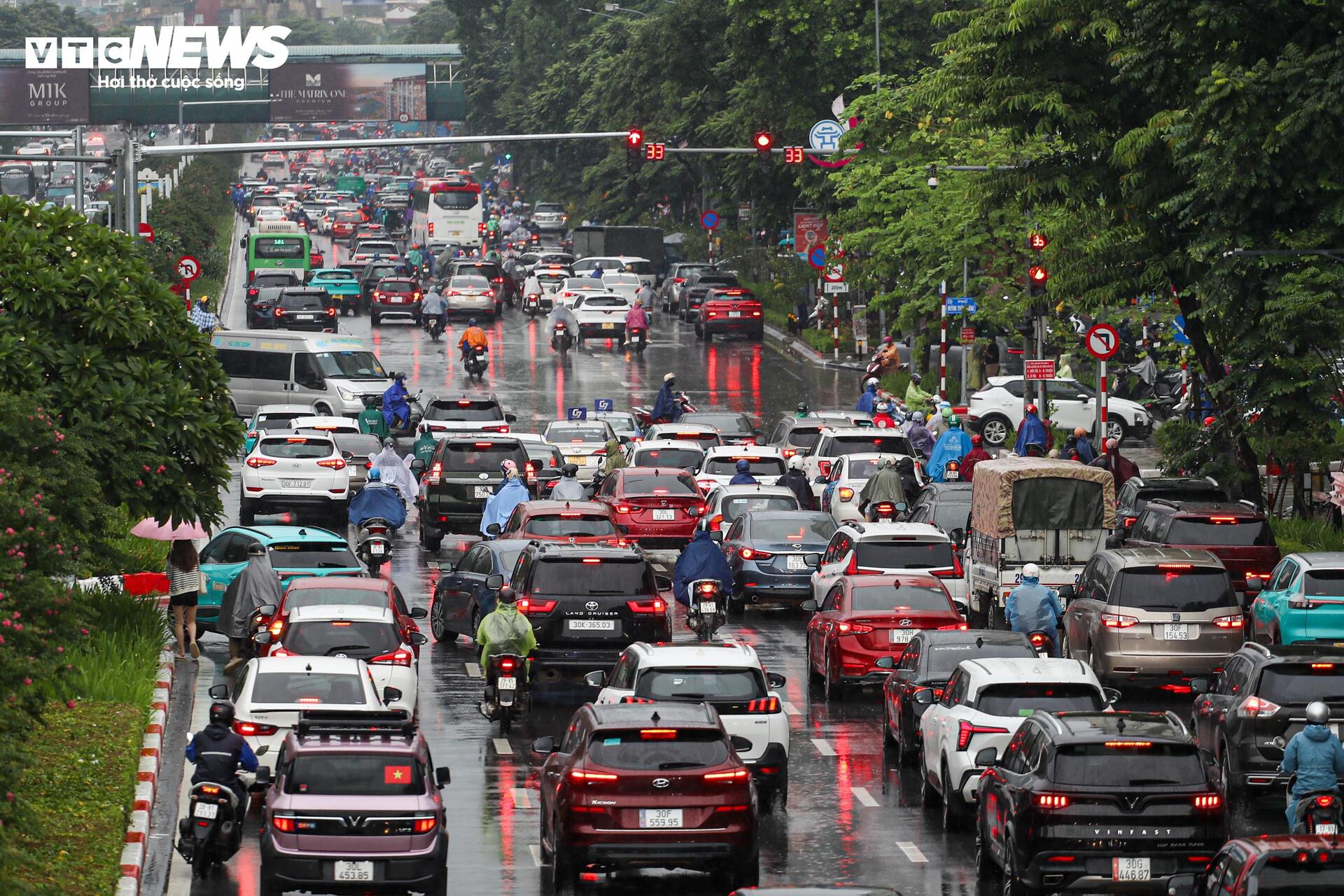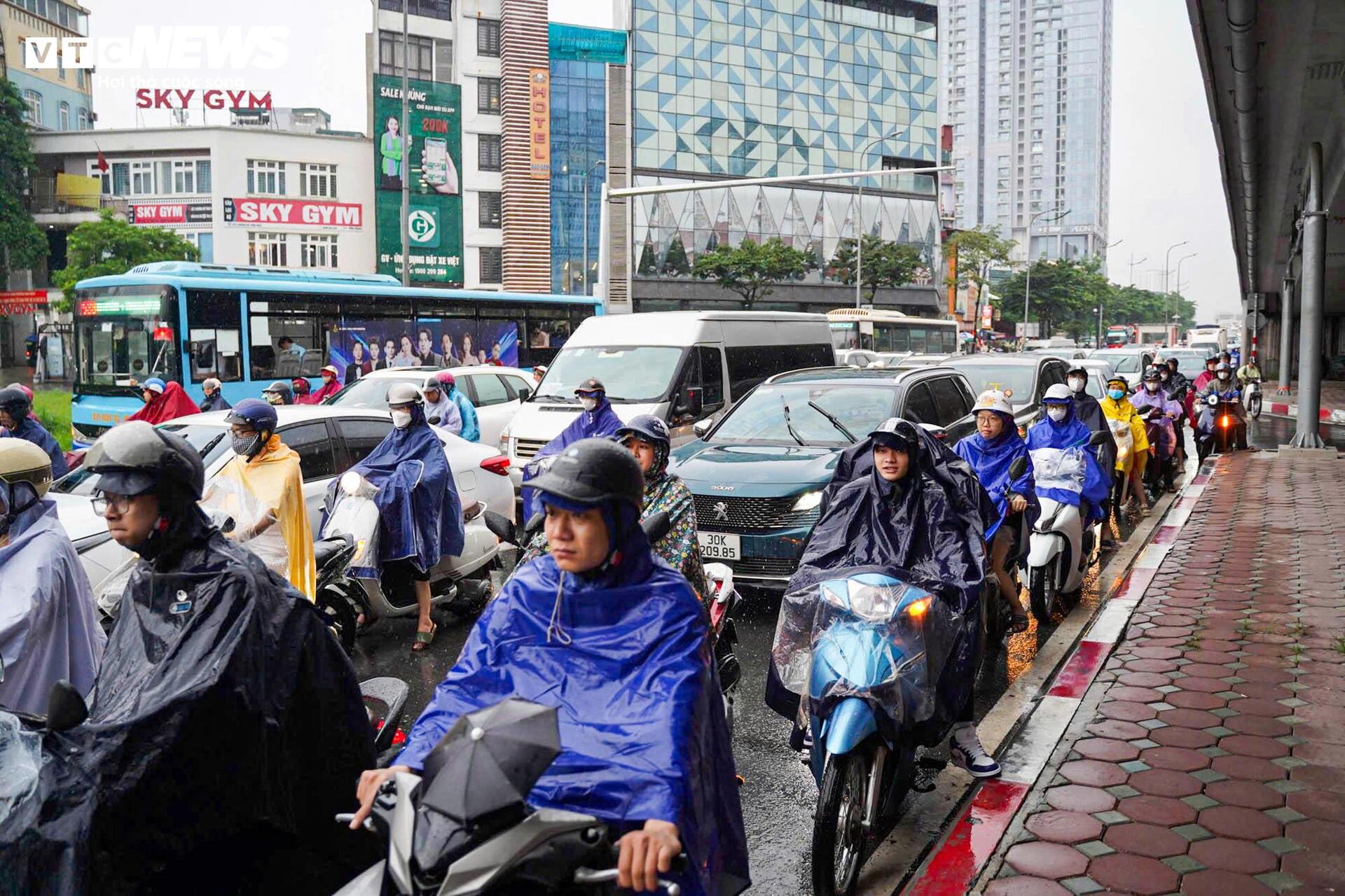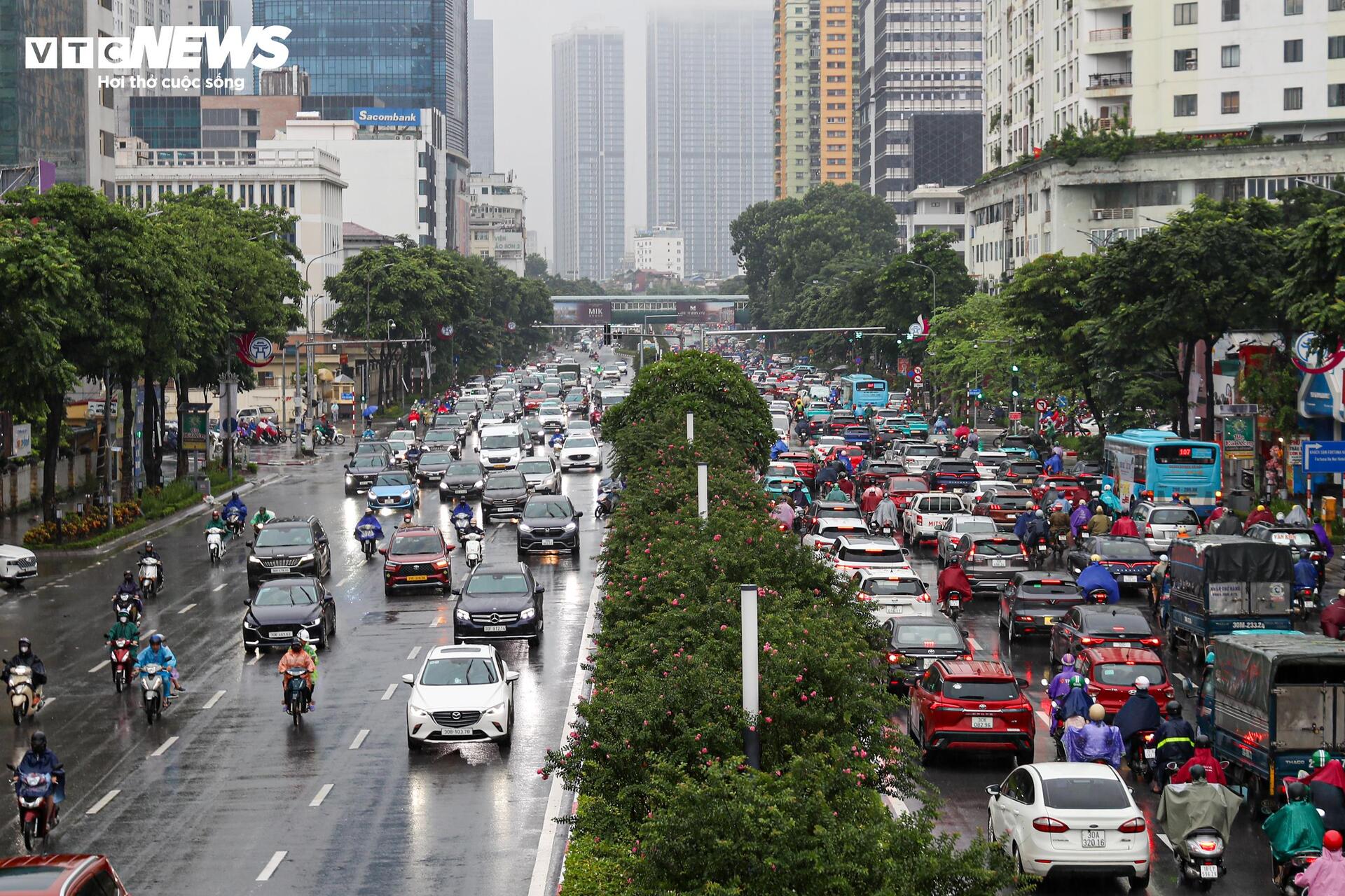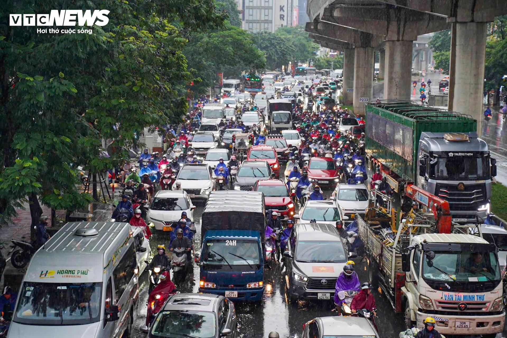 Cùng thời điểm, tại phố Chùa Hà, mưa lớn và mật độ phương tiện dày đặc khiến giao thông gần như tê liệt, các xe phải nhích từng chút để di chuyển.