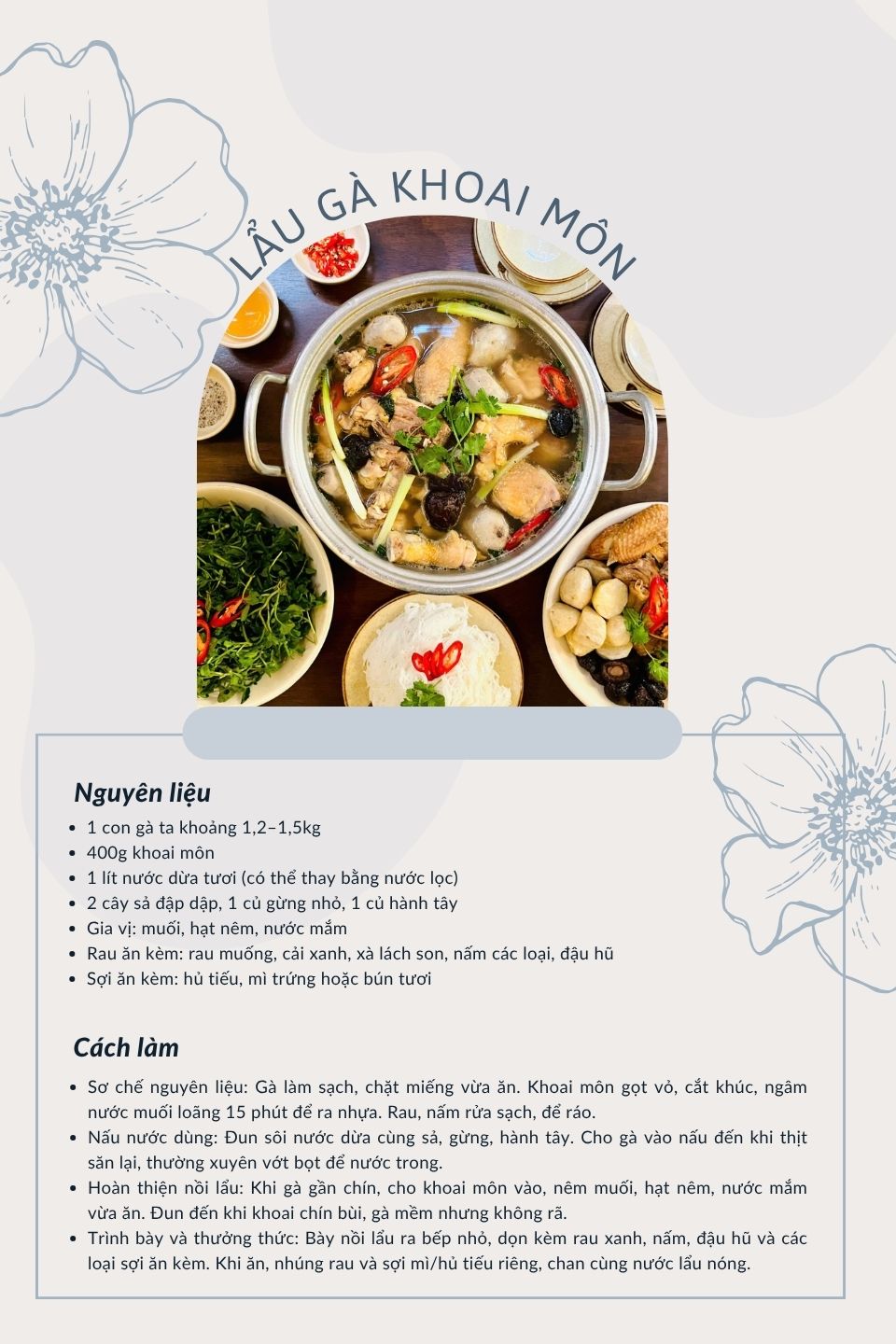 Không quá cầu kỳ nhưng vẫn trọn vị, lẩu gà khoai môn phù hợp cho bữa trưa gia đình hay nhóm bạn tụ họp cuối tuần. Thịt gà ngọt chắc, khoai môn bùi bùi, nước dùng thanh dịu hòa cùng rau xanh, nấm, đậu hũ giúp món ăn dung hòa giữa no bụng và thanh mát.