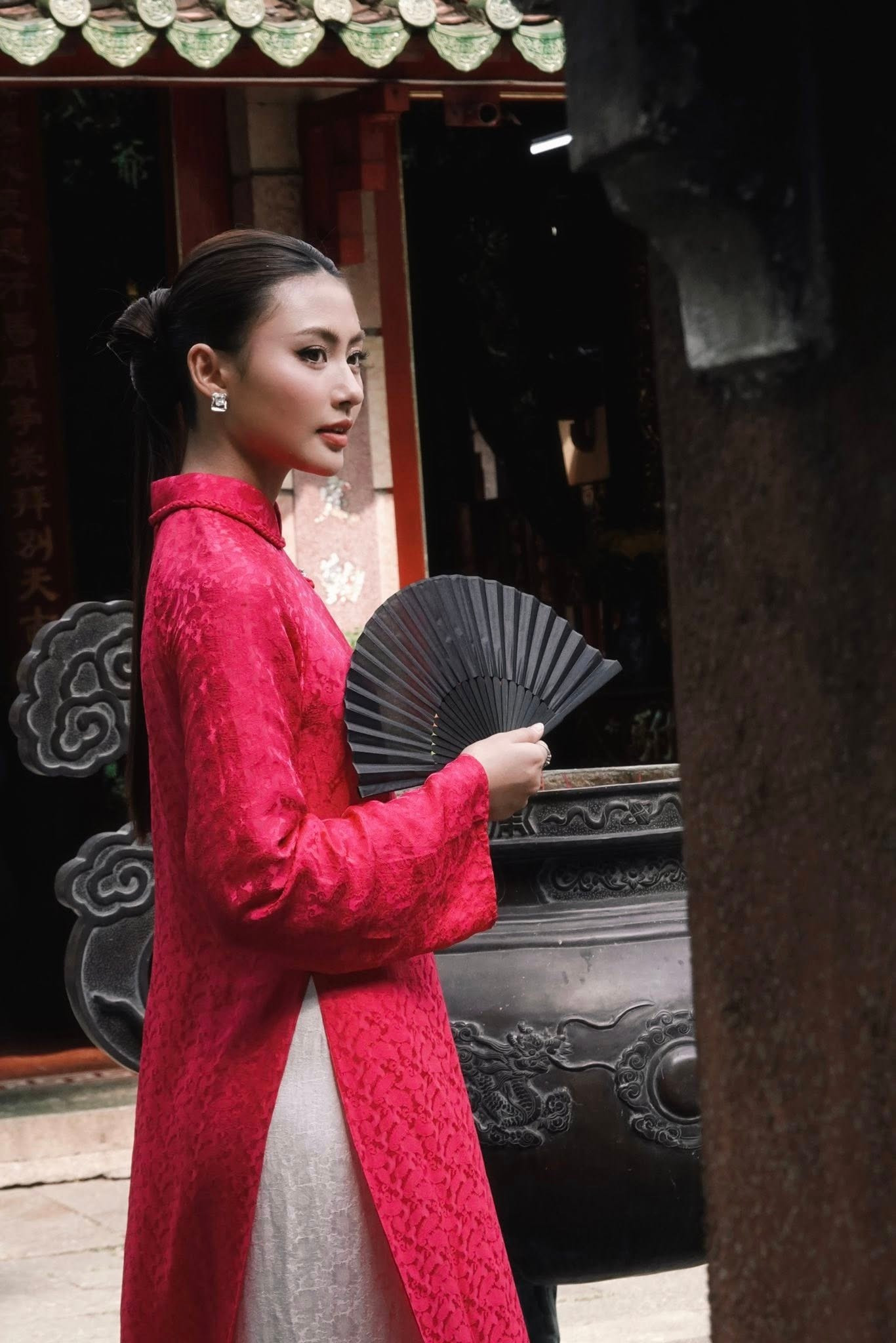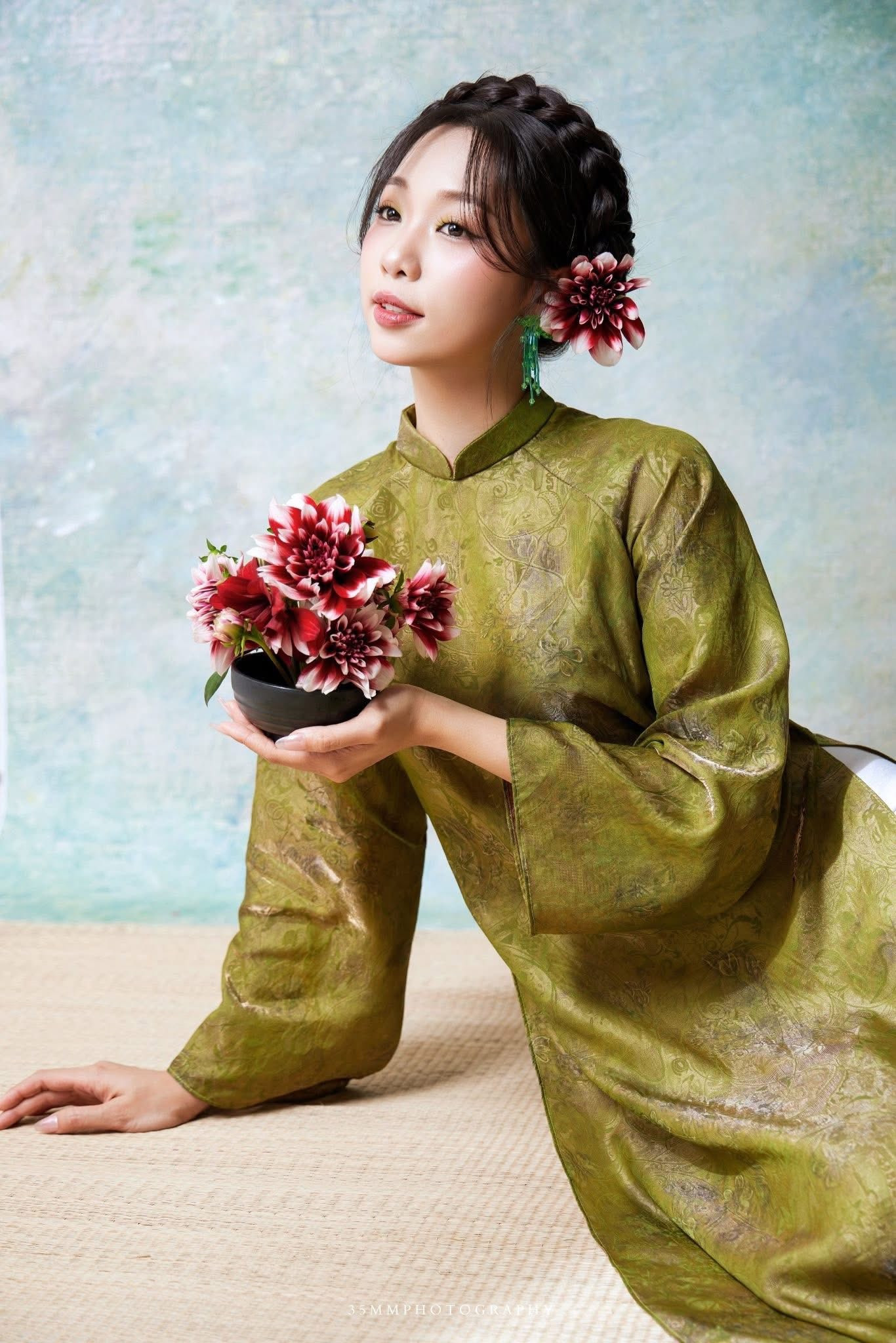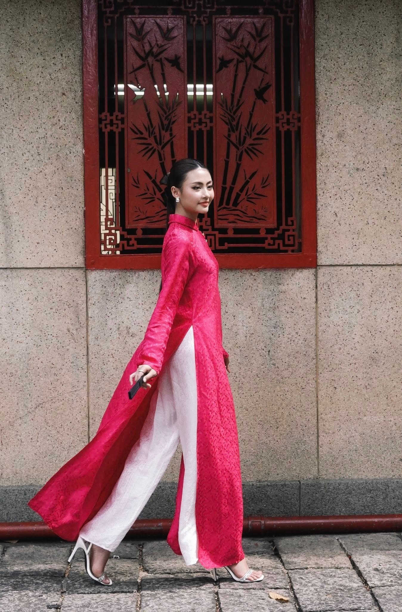 Đại sứ Du lịch & Môi trường Hoa hậu Việt Nam 2024 Phạm Thùy Dương khoe bộ ảnh áo dài với hoa thược dược đỏ vô cùng hút mắt.