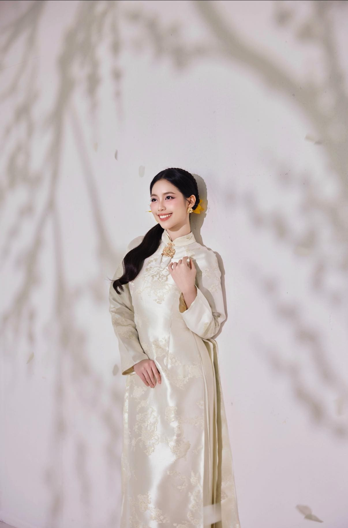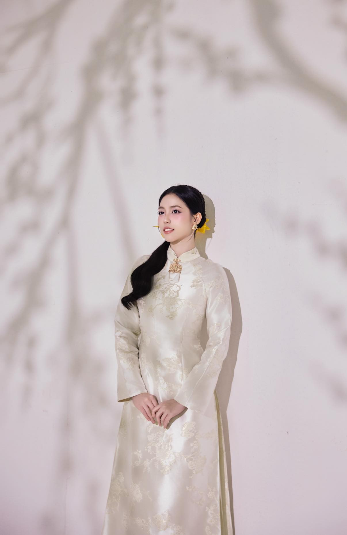 Bộ ảnh với áo dài gấm màu trắng của Châu Anh cũng ấn tượng không kém. Nàng hậu khoe nhan sắc dịu dàng, đẹp như tranh vẽ.