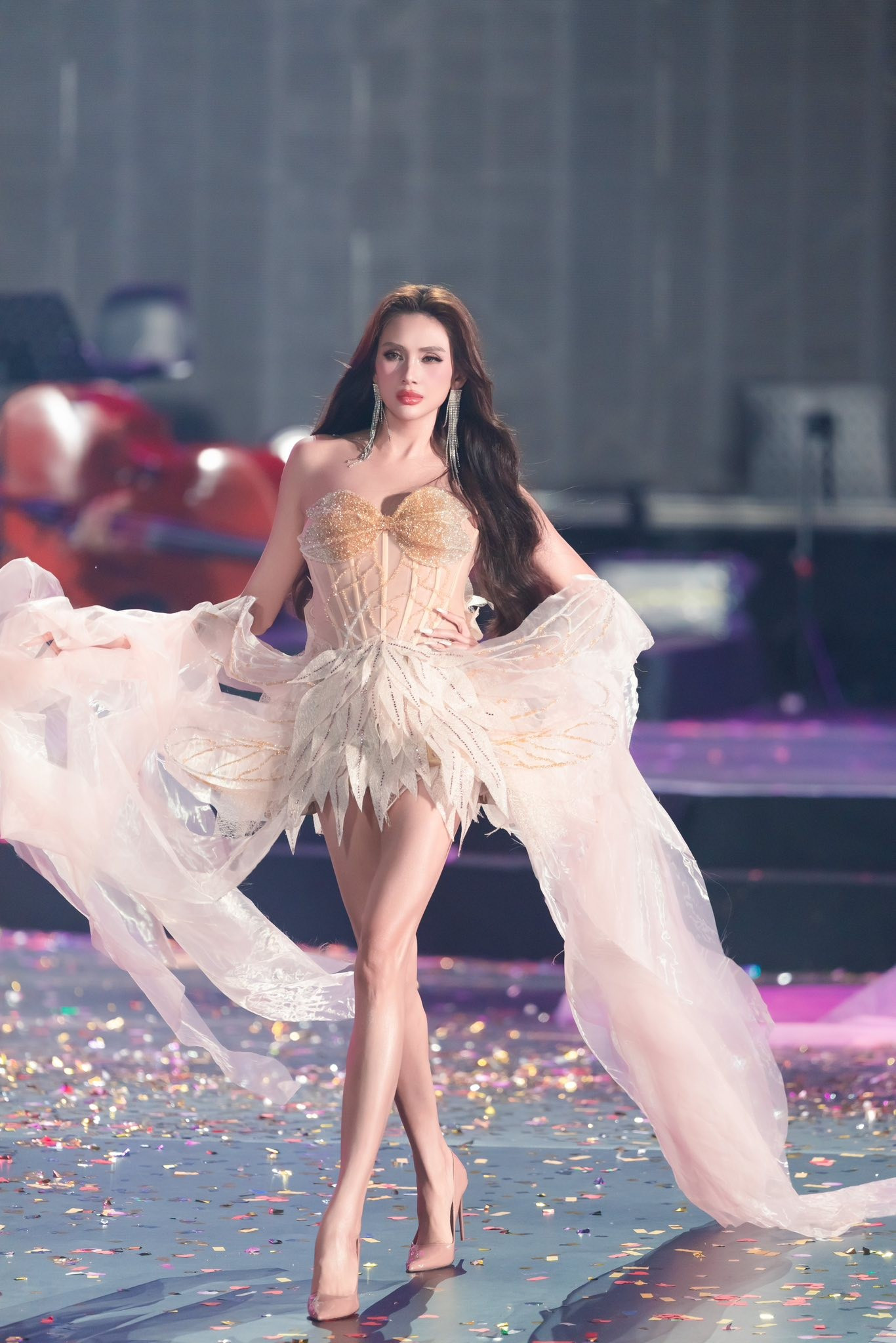 Hoa hậu Hương Giang không đeo cánh thiên thần, cô chọn thiết kế dạ hội gam màu vàng nhạt, lộng lẫy đúng chuẩn beauty queen.