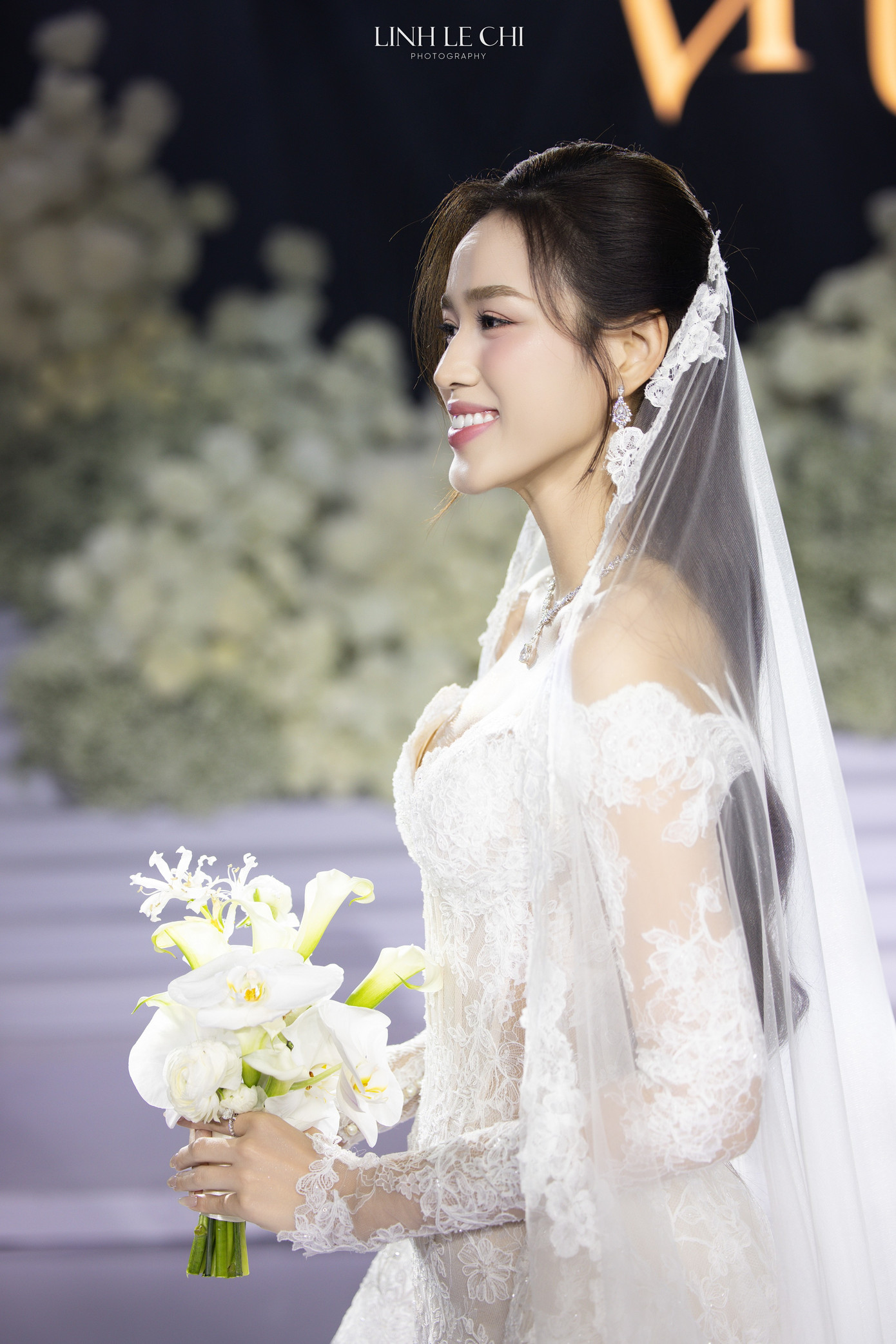 Không gian đám cưới được trang trí bằng hoa tươi. Chính giữa sân khấu là biểu tượng chữ viết tắt tên Đỗ Hà và Viết Vương.