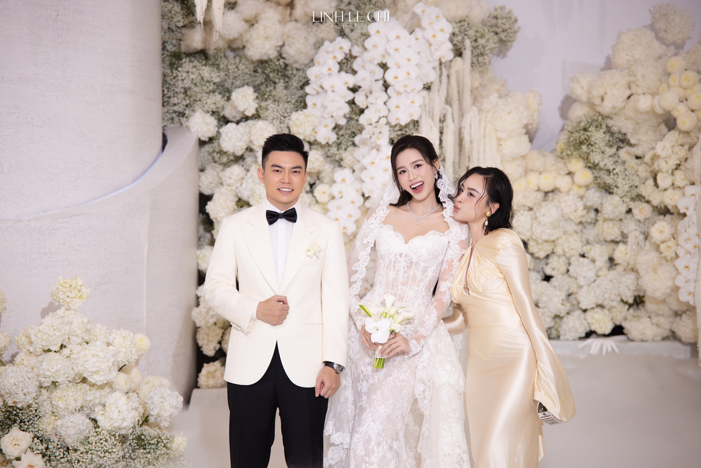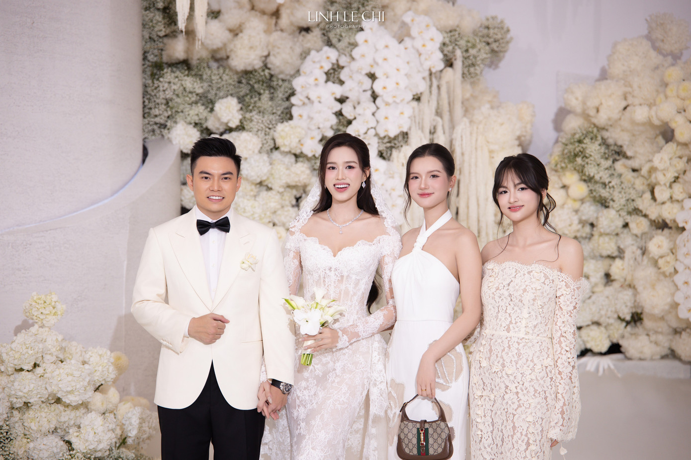 Dù mới sinh con, Hoa hậu Ngọc Hân và Á hậu Thụy Vân vẫn rạng rỡ trong đám cưới Đỗ Hà.
