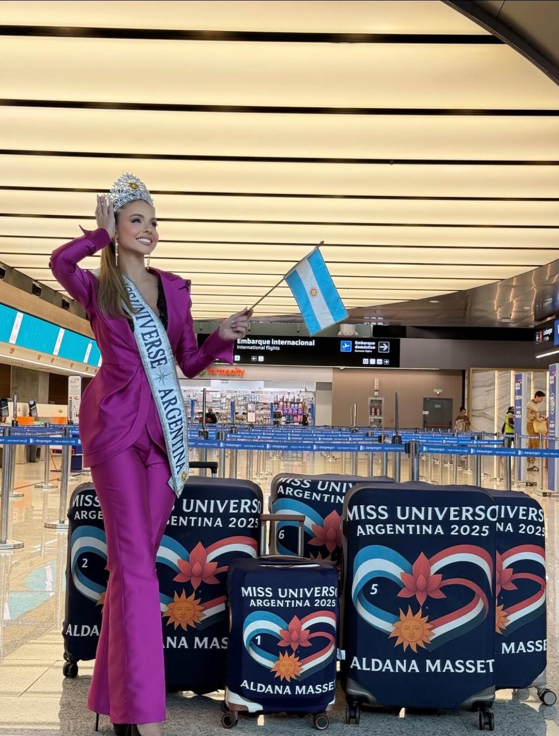 Đại diện Argentina - Aldana Masset diện suit tông màu tím thanh lịch, sang trọng khi ra sân bay. Cô ghi điểm với gương mặt khả ái, rạng rỡ. Người đẹp năm nay 25 tuổi, là ca sĩ và chuyên gia tư vấn hình ảnh. Aldana được xem là ứng viên tiềm năng của khu vực châu Mỹ.