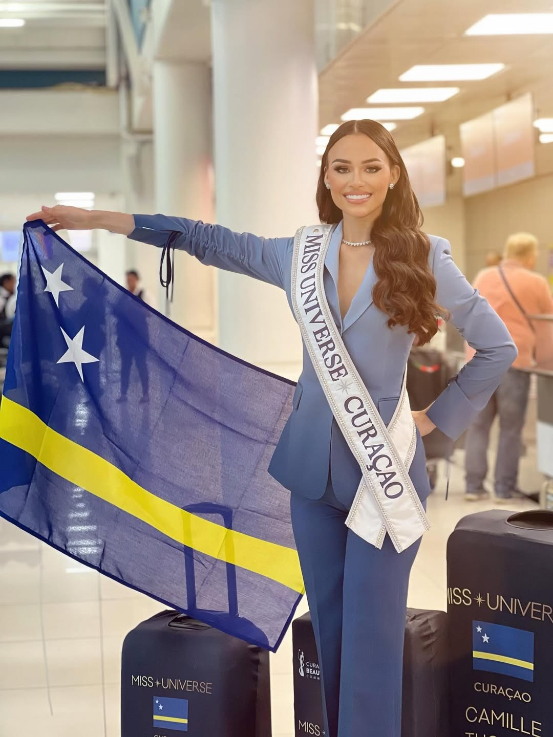 Đại diện Curacao - Camille Thomas mặc trang phục màu tím ở sân bay. Cô có gương mặt khả ái, nụ cười tươi.