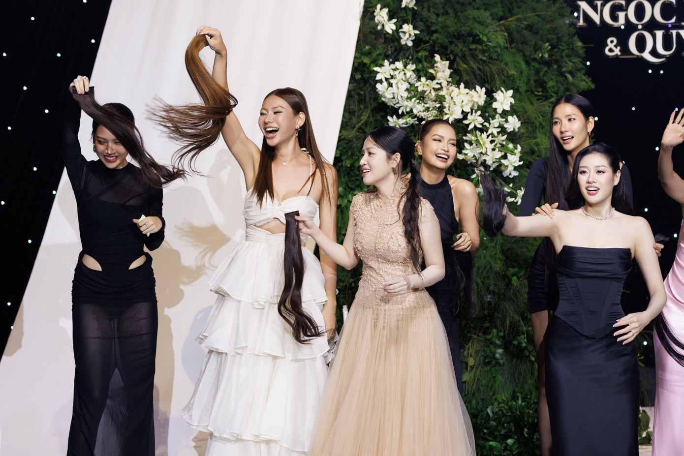 Á hậu Phương Anh chọn váy đen cổ thuyền tối giản, kết hợp trang sức ngọc trai. Bên cạnh, Á hậu Tuyết Như diện váy trắng dáng bất đối xứng, khoe vai trần khỏe khoắn. Cả hai đồng loạt chọn lối trang điểm nhẹ, tinh tế.