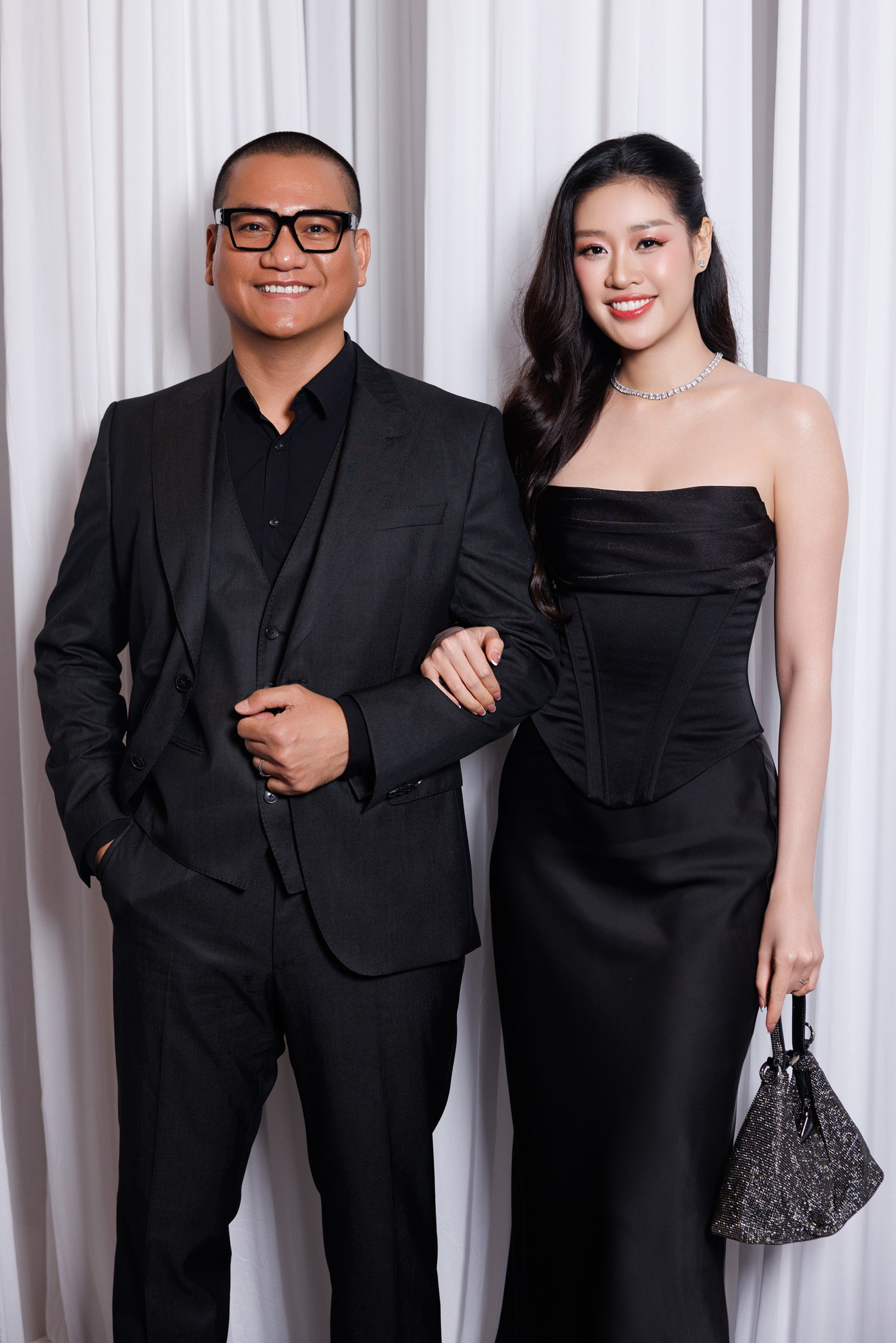 Hoa hậu Ngọc Châu và Á hậu Thủy Tiên cùng chọn tông đen đồng điệu. Ngọc Châu diện váy quây suông với thiết kế tối giản, trong khi Thủy Tiên chọn dáng cổ yếm tôn bờ vai thon. “Nhà Hoàn vũ” gây ấn tượng với phong thái sang trọng và gu thời trang tinh tế khi đến chúc mừng Á hậu Hòa bình Quỳnh Châu.