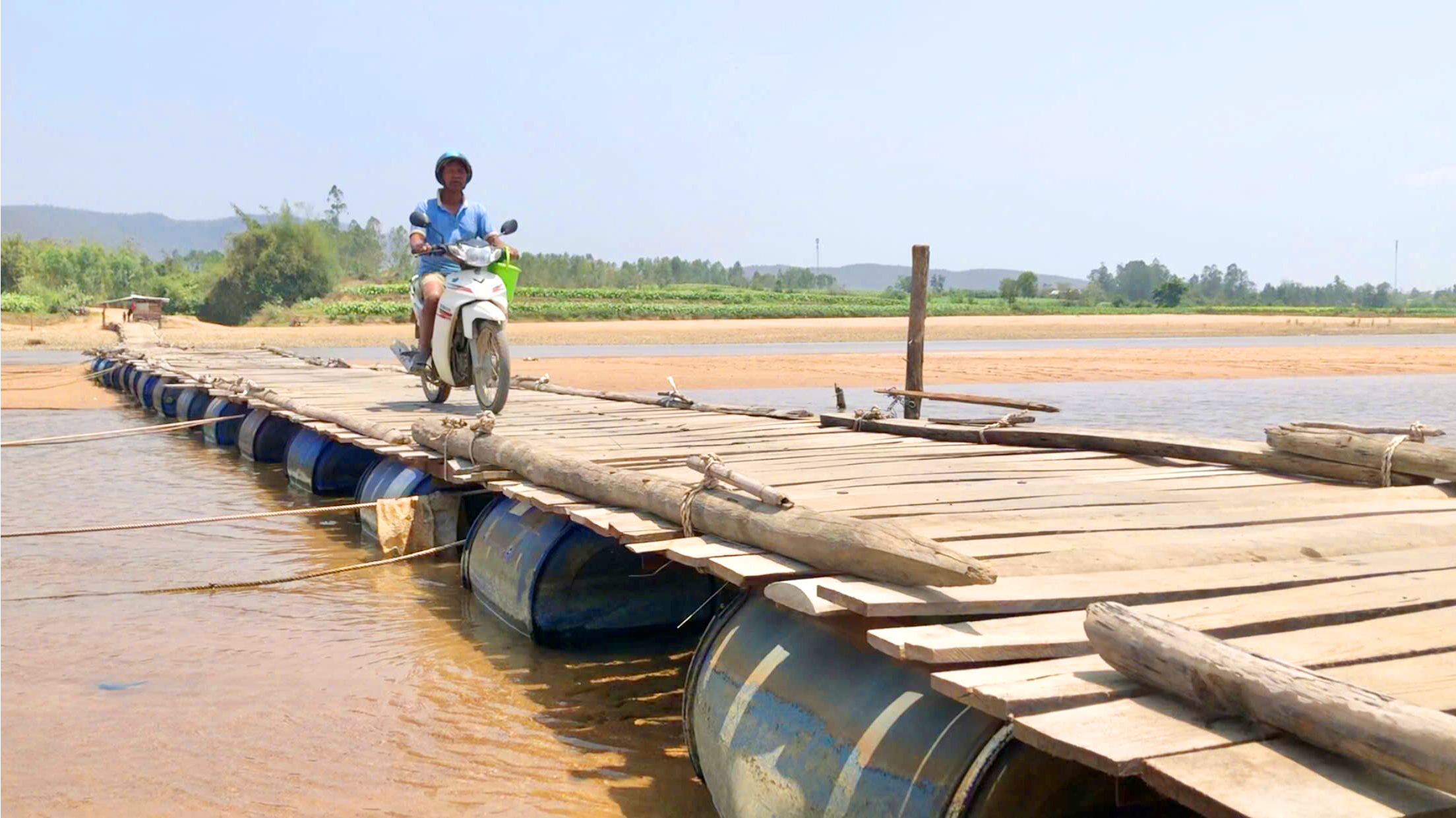 Để "tự giúp mình", khi mùa lũ qua đi, hàng chục hộ dân tại đây lại cùng nhau góp tiền, góp sức dựng cầu phao tạm qua sông. Theo ghi nhận, cây cầu tạm dài hơn 200 m được kết nối thủ công từ những chiếc thùng phuy nhựa, ván gỗ cũ và dây thừng.