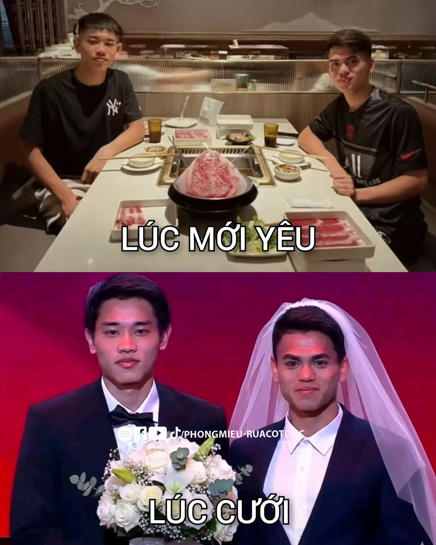 Sang bức ảnh thứ hai, cả hai diện vest lịch lãm, cầm hoa cưới, thậm chí còn được thêm cả khăn voan, tạo nên khung hình khiến nhiều người không nhịn được cười. Chú thích “lúc cưới” vì thế càng làm tăng độ “mặn” cho màn ghép ảnh.