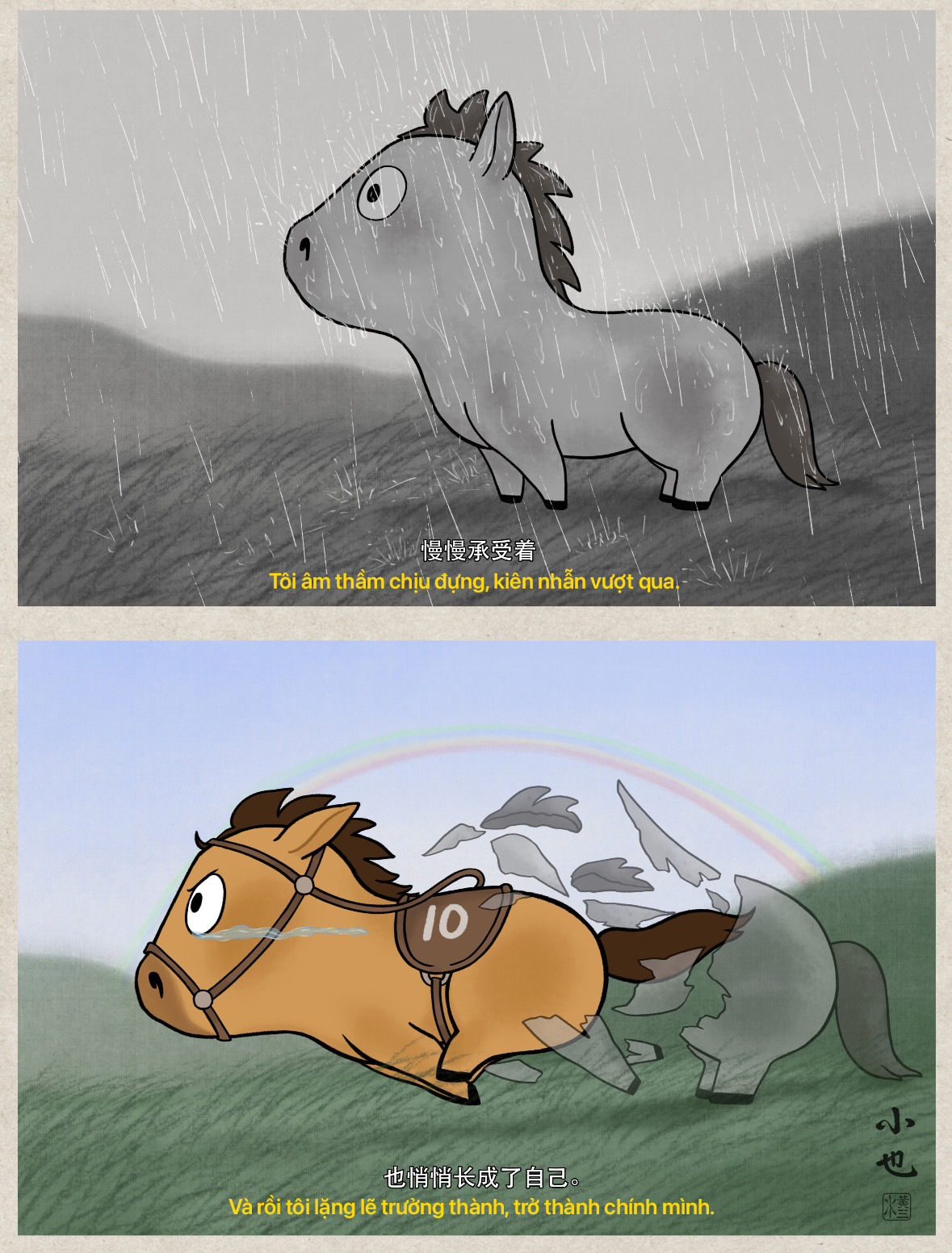 “Cái gì không làm được thì mình có thể vừa khóc vừa làm. Ngựa tốt biết đường còn dài, chẳng cần roi thúc cũng tự dốc sức chạy. Chiếc bờm oai phong trong tương lai chính là những giọt nước mắt mà chú ngựa nhỏ từng rơi"; "Đời mà, có 10 chuyện thì 8 - 9 chuyện không theo ý mình. Mong ai cũng có giống như chú ngựa trong hình, dù có chuyện gì cũng phải nỗ lực không nghỉ"; "Có người bảo tôi rằng ngựa xích thố thì cũng từng chỉ là một chú ngựa non mà thôi. Nỗ lực hôm nay khẳng định mình là ai mai sau"...