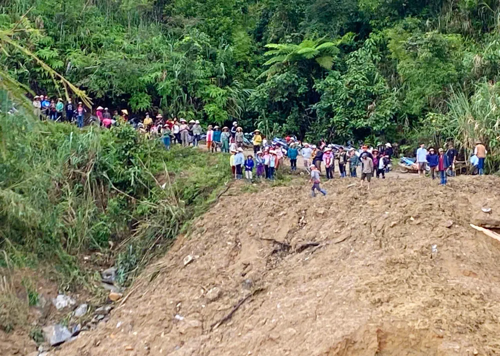 Sáng 31-10, xã Ngọc Linh (tỉnh Quảng Ngãi) huy động hơn 100 người gồm công an, dân quân, cán bộ và thanh niên mở đường mòn băng qua điểm sạt lở để tiếp tế lương thực cho hơn 400 hộ dân ở thôn Ngọc Nang, Mô Po, Xa Úa, Ngọc Lâng và Tu Răng bị cô lập do sạt lở núi.