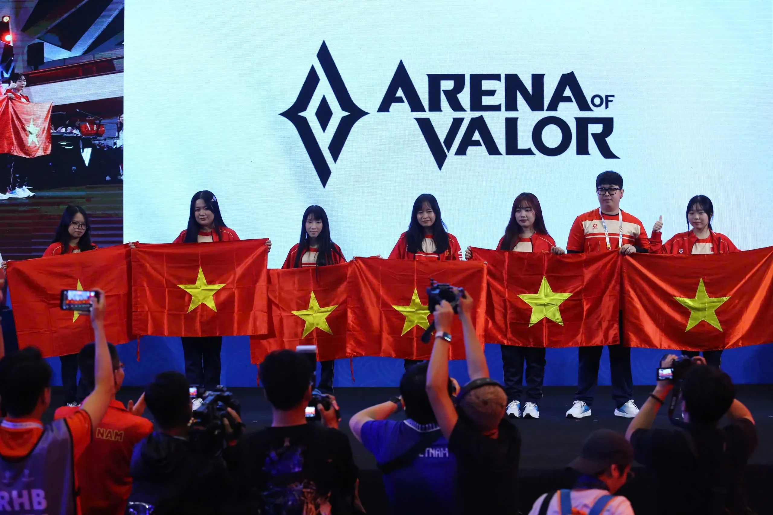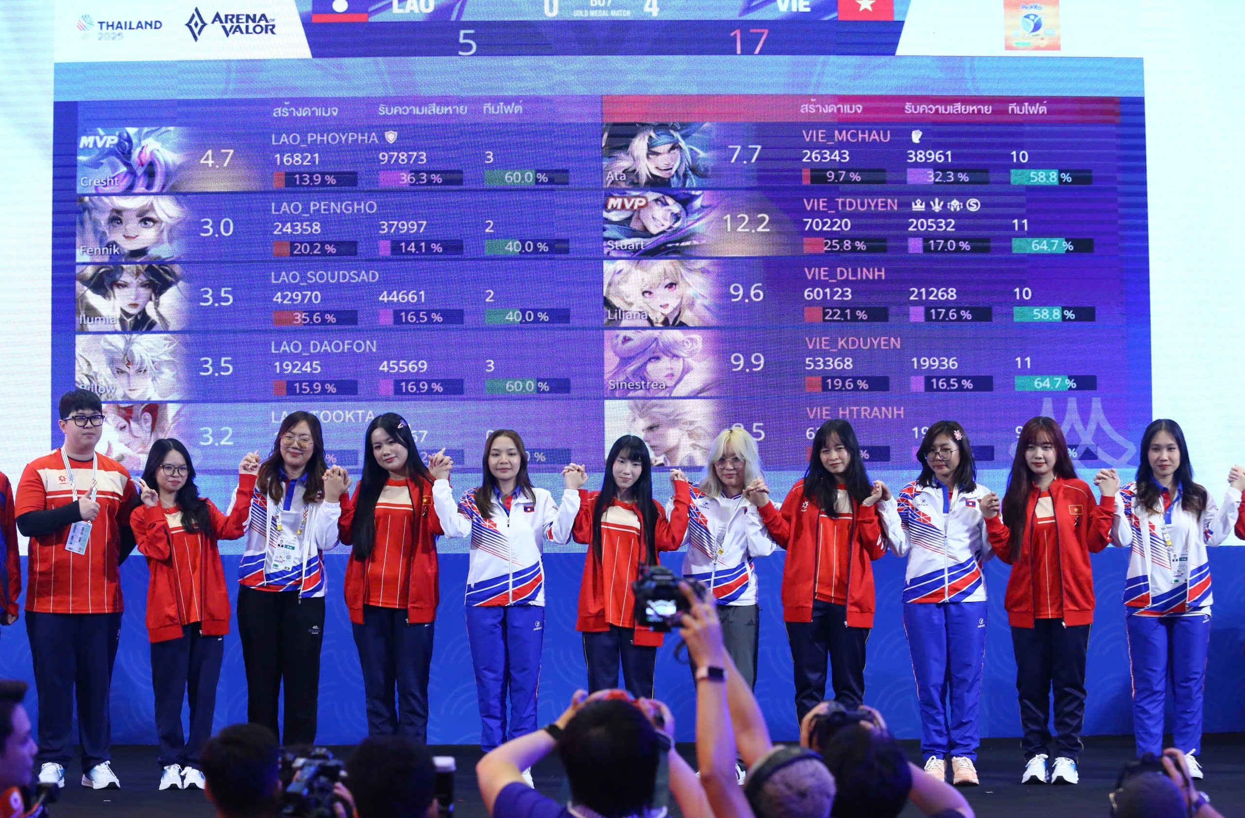 Đội tuyển Liên Quân Mobile nữ (thuộc bộ môn thể thao điện tử - eSports) Việt Nam đã có ngày thi đấu (16/12) rực rỡ với chiến thắng toàn diện, thành công mang về huy chương vàng. Sau khi Thái Lan rút lui vì bê bối gian lận của thành viên Tokyogurl (tên thật là Napat Warasin), tuyển Việt Nam hạ đội Lào với tỷ số 4-0 ở chung kết, lên ngôi vô địch tại SEA Games 33. Ảnh: Minh Chiến.