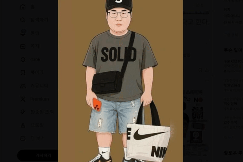 Hình ảnh minh họa về một người đàn ông ngoài 40 tuổi đội mũ Supreme, mặc áo phông logo cỡ lớn, quần short, tất Nike cao cùng giày thể thao đã lan truyền rộng rãi ở Hàn Quốc. Ảnh: @JONGY064/X.