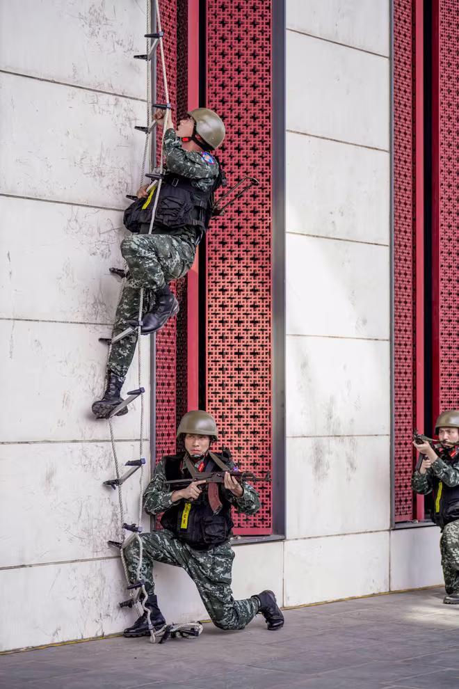 Dưới sự chỉ huy chặt chẽ, đội hình nhanh chóng chia thành bốn mũi tấn công, triển khai áp sát mục tiêu từ các hướng khác nhau. Không tiếng nói, không một tín hiệu thừa, chỉ có ánh mắt thay lời chỉ huy, và sự đồng bộ tuyệt đối trong từng nhịp tiến quân. Đó không chỉ là bài diễn tập, mà là bản tái hiện sống động tinh thần thép và sự chính xác tuyệt đối của những người mang trong tim hai chữ “bình yên”.