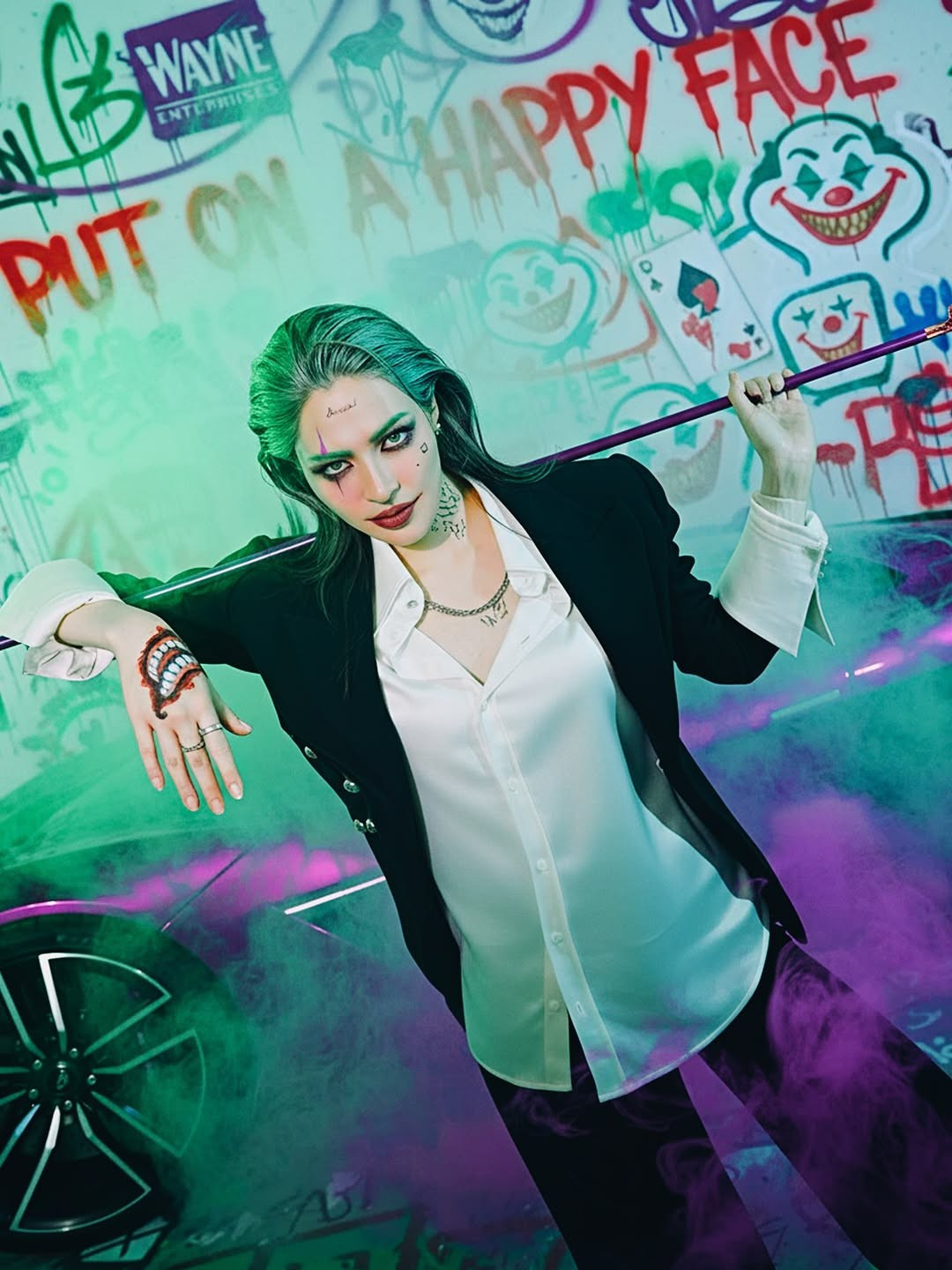 gây sốt khi nhập vai Joker, ác nhân nổi tiếng trong vũ trụ DC. Sao nữ sinh năm 1995 hóa thân mượt mà vào vai phản diện từ mái tóc xanh, nụ cười đầy ám ảnh. Loạt ảnh của sao phim girl love The Secret Of Us đạt gần nửa triệu lượt thích chỉ sau 1 ngày.