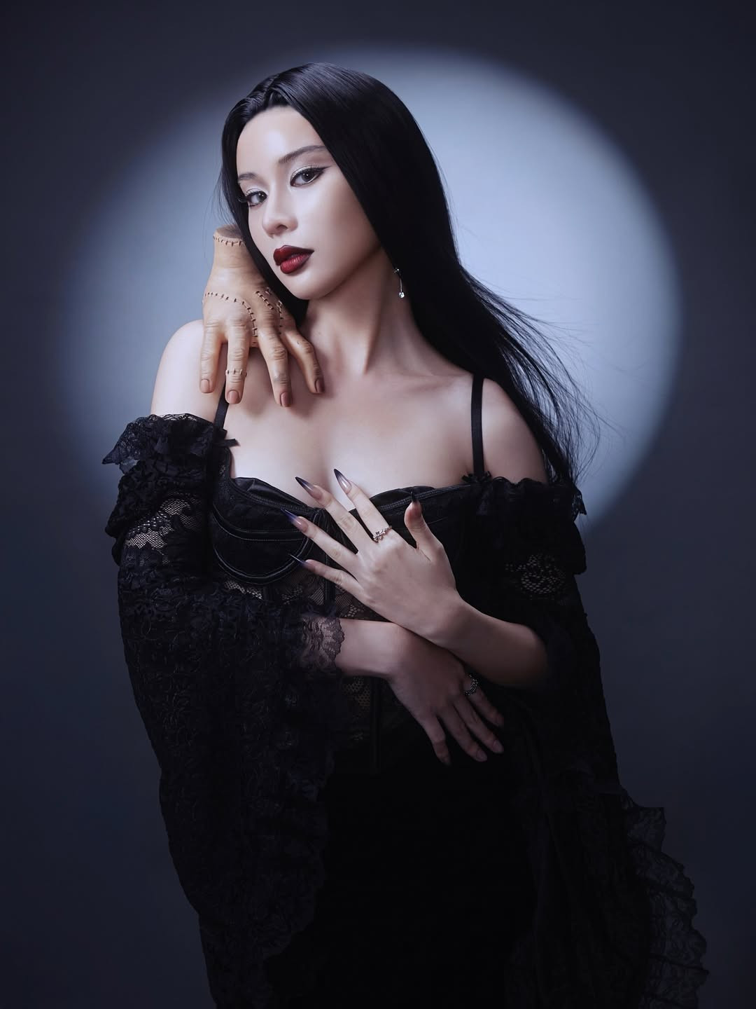 lựa chọn phong cách gothic cổ điển, hóa thân thành Morticia Addams trong The Addams Family (1991). Với mái tóc đen buông dài, trang phục quyến rũ và ánh nhìn u ám, quyền lực, mỹ nhân Thái được ví như “bản sao sống” của nhân vật huyền thoại.