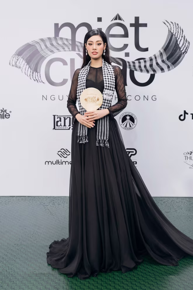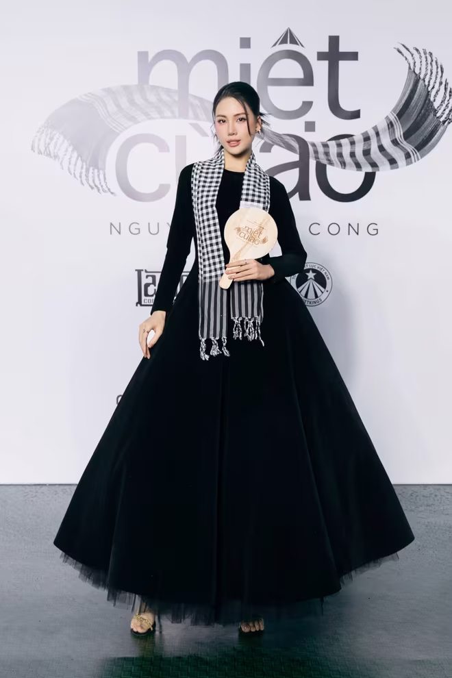 Hoa hậu Bùi Quỳnh Hoa nổi bật khi kết hợp khăn rằn cùng váy xòe vừa thanh lịch, vừa kín đáo