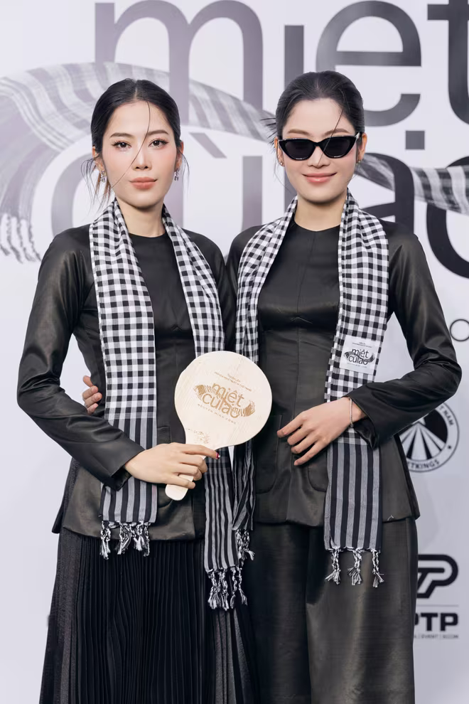 Cặp chị em sinh đôi Nam Anh - Nam Em cùng diện áo bà ba kết hợp cùng khăn rằn mang đạm dấu ấn Nam Bộ