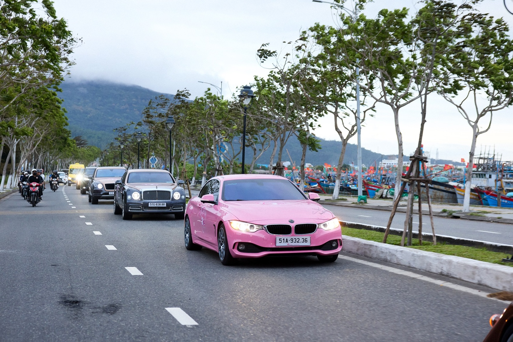 Dàn xe diễu hành của ông Hoàng Kim Khánh còn có sự góp mặt của chiếc BMW 4 Series mui trần. Xe có màu sơn gốc trắng, trước khi được dán/sơn đổi màu sang hồng.