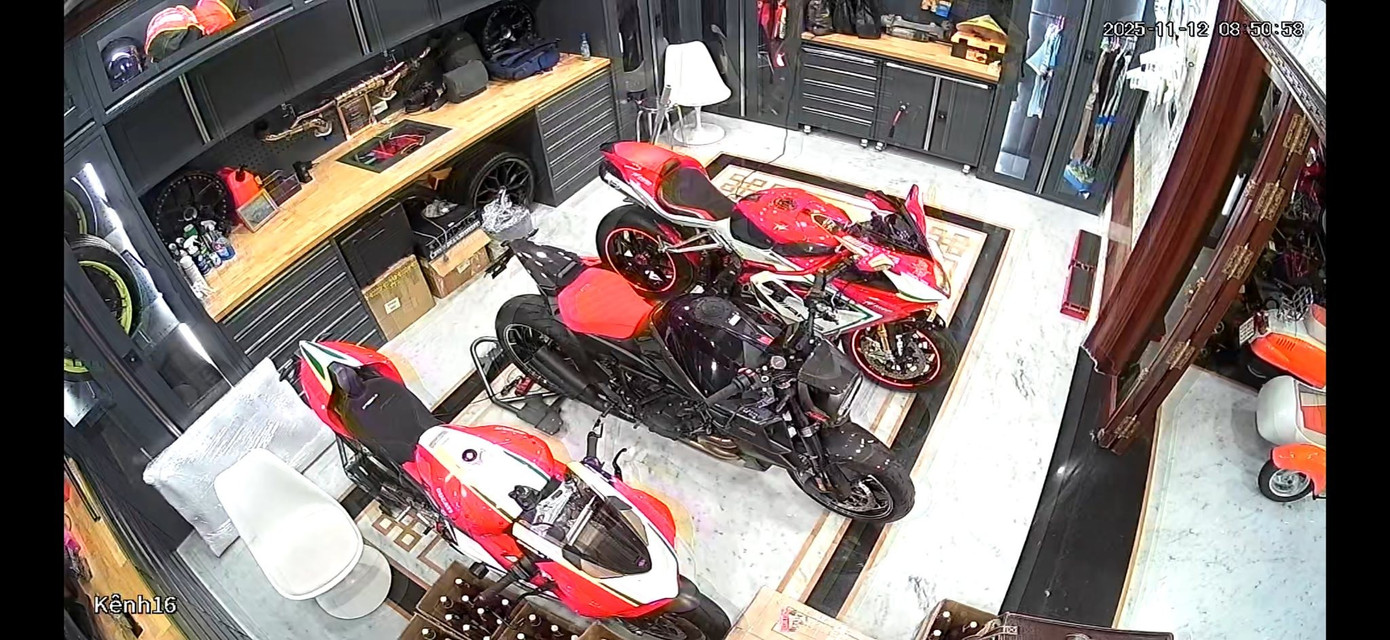 Không gian gara còn có khu kỹ thuật mini, tủ dụng cụ, kệ phụ tùng, phòng bảo trì mô tô – cho thấy đây không chỉ là nơi đậu xe mà còn là “phòng trưng bày” được đầu tư kỹ lưỡng.