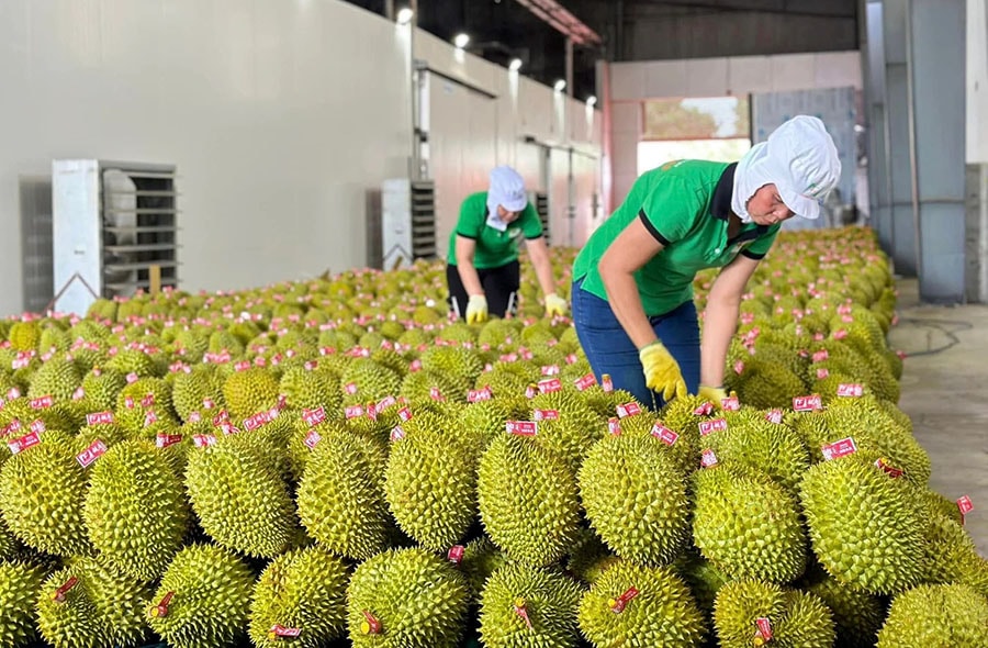 Kiểm tra chất lượng sầu riêng xuất khẩu tại Công ty cổ phần Tập đoàn Xuất nhập khẩu trái cây Chánh Thu. Ảnh: Thu Chánh