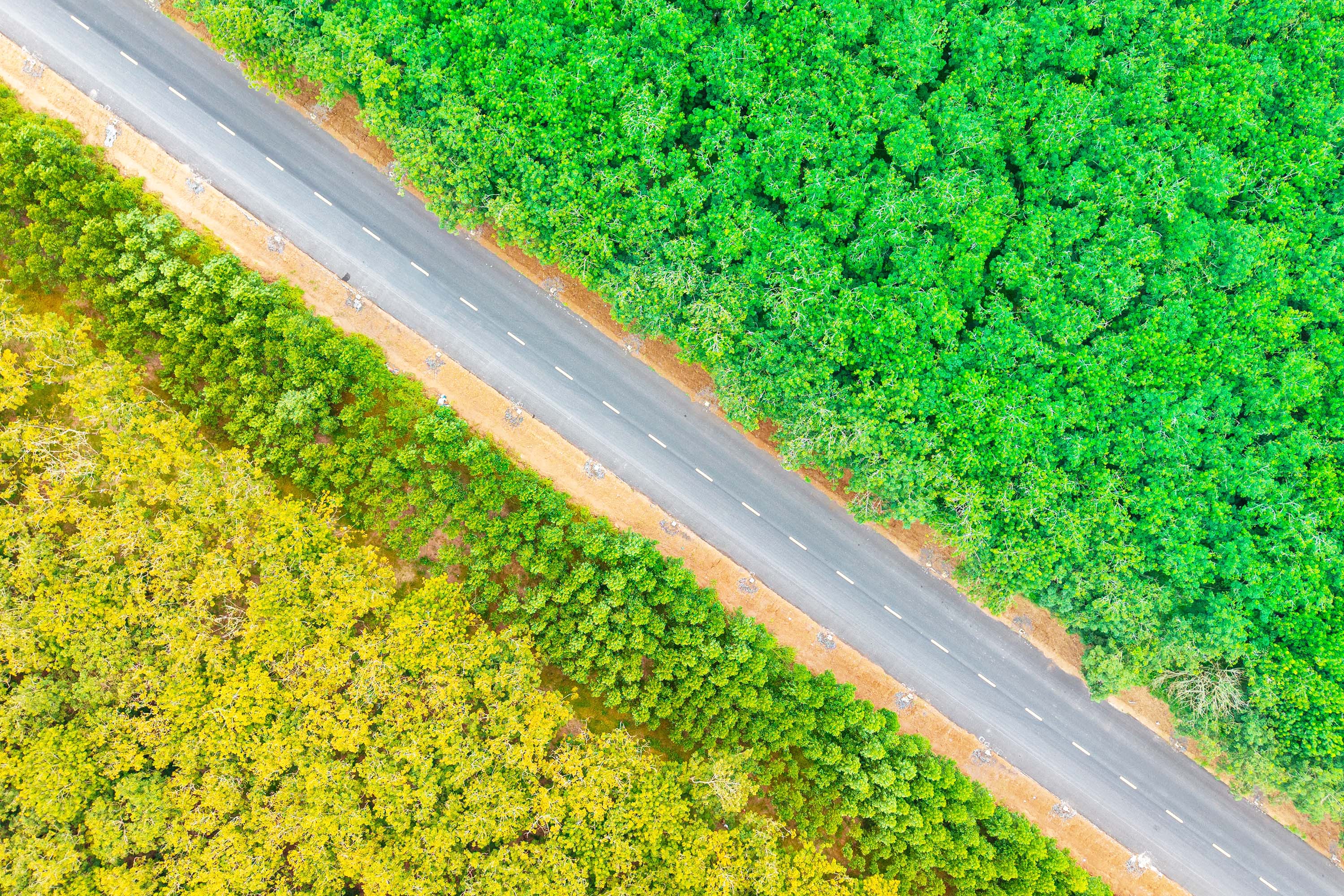 Nhìn từ trên cao, con đường vươn dài giữa rừng cao su rợp sắc xanh và vàng mùa cây thay lá