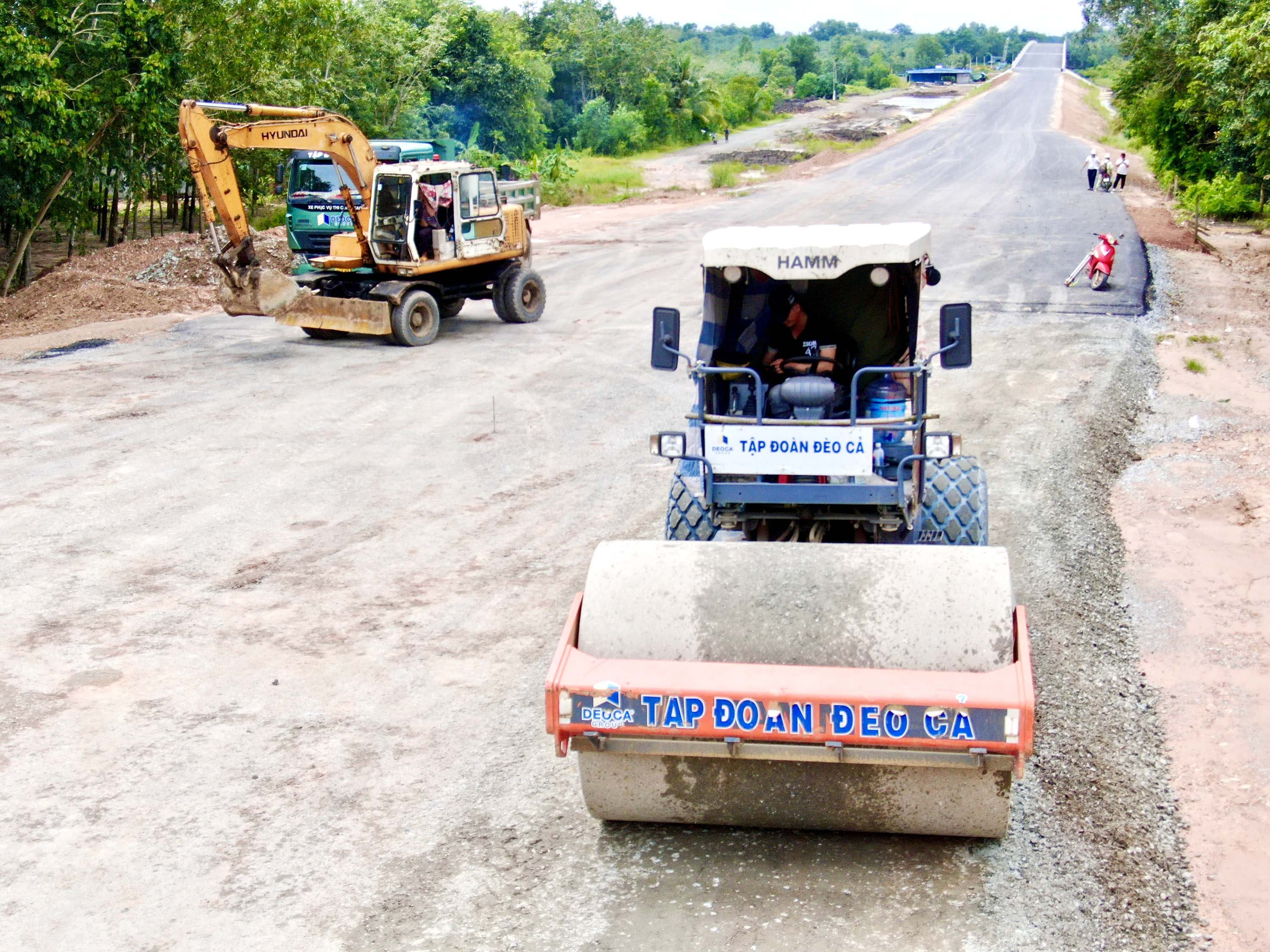 Máy xúc và xe lu thi công mặt đường trên tuyến Hồ Chí Minh đoạn qua TPHCM