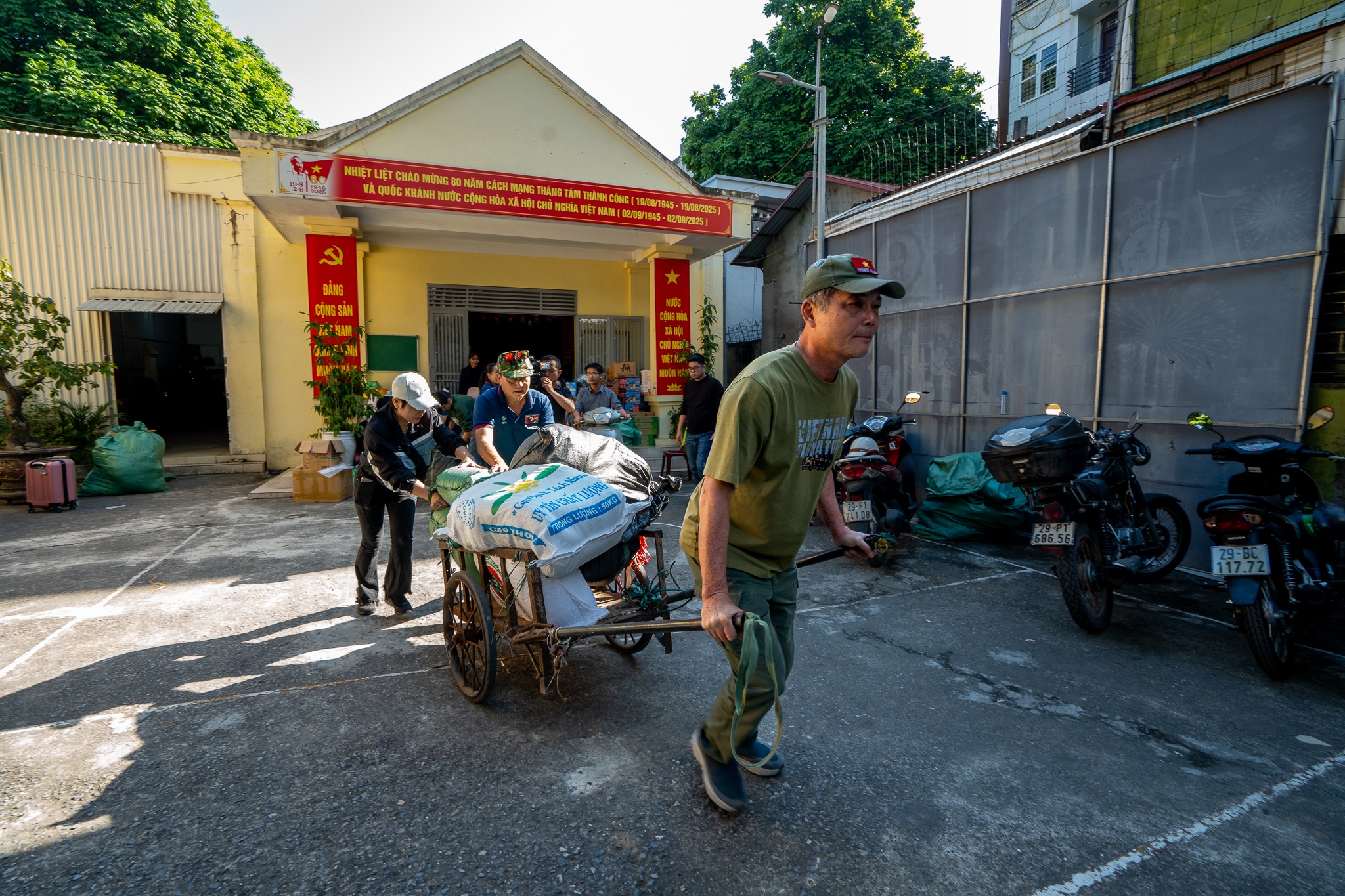 Từng xe tải 10 tấn được người dân truyền tay nhau xếp lên xe, thùng xe phủ kín bằng những bao gạo, thùng mì, nước uống và chăn màn do người dân đóng góp. Toàn bộ số hàng được phân loại, buộc cố định để kịp vận chuyển đến các xã đang bị ảnh hưởng nặng bởi mưa lũ ở miền Trung. Chuyến xe sẽ di chuyển xuyên đêm để bảo đảm hàng cứu trợ đến tay bà con trong thời gian sớm nhất.
