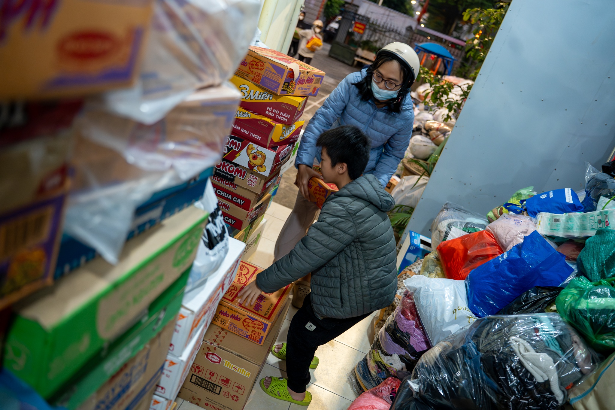 Chị Nguyễn Như Quỳnh (34 tuổi, Xuân Đỉnh) cùng con trai góp đồ cứu trợ chia sẻ cảm xúc khi nhìn cảnh bà con phải đối mặt với lũ suốt những ngày qua, chị càng muốn đóng góp. Gia đình chị gom góp đồ gửi cho các cháu, đồng thời mua thêm một số nhu yếu phẩm thiết yếu để hỗ trợ bà con.