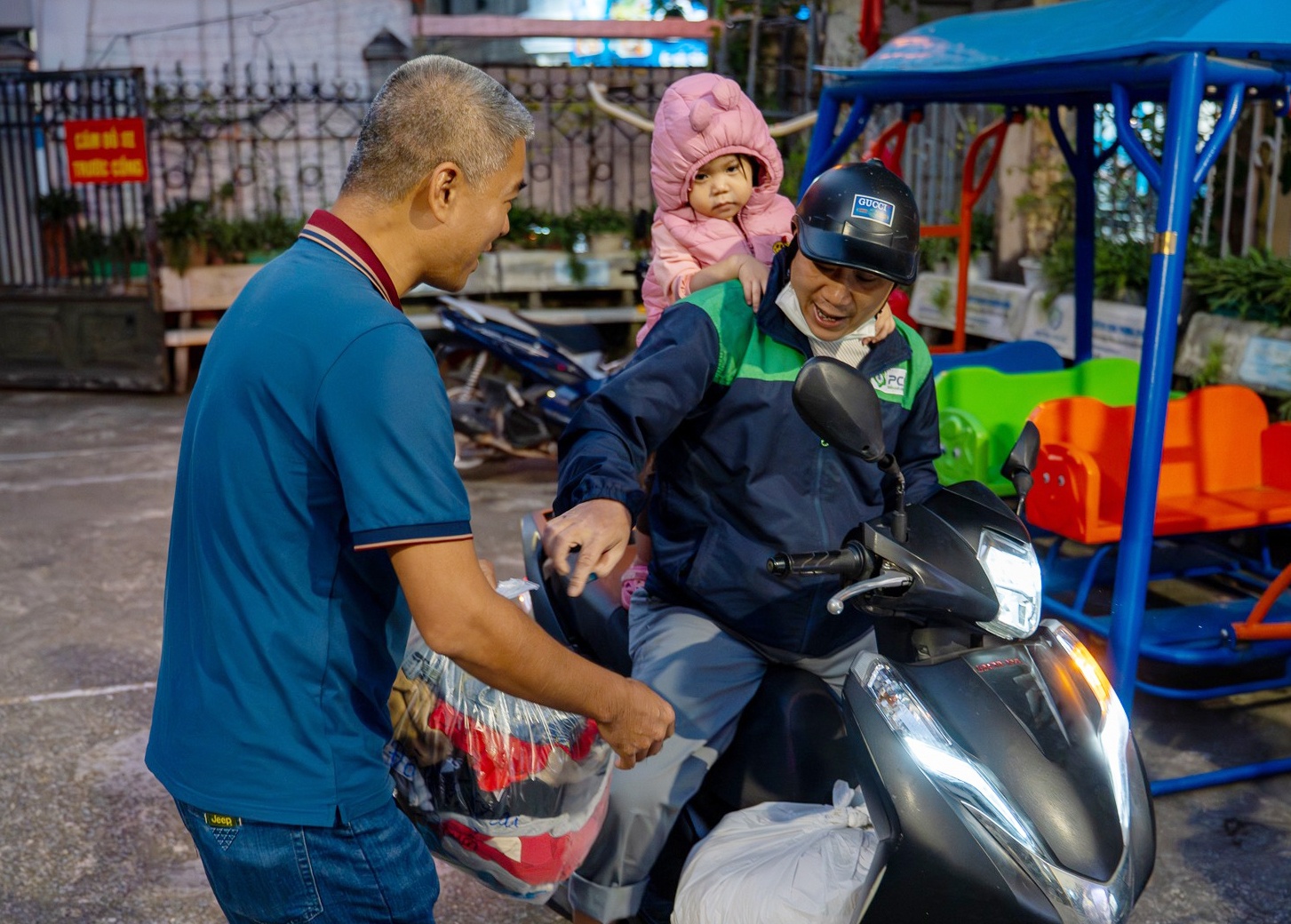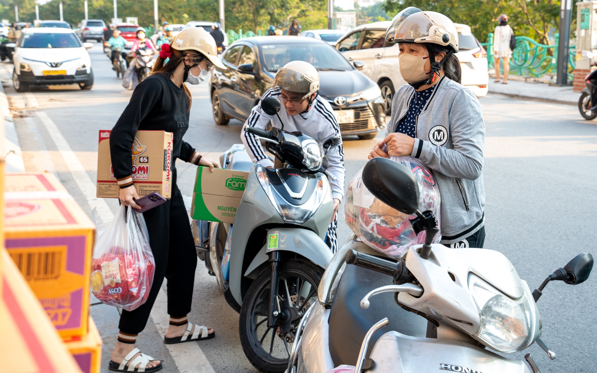 Nhiều người và gia đình tranh thủ ngày nghỉ mang quần áo, thực phẩm cần thiết tới quyên góp hỗ trợ đồng bào miền Trung. Một số khác biết điểm tiếp nhận qua mạng xã hội, không tiện ghé trực tiếp nên gửi đồ qua tài xế công nghệ.