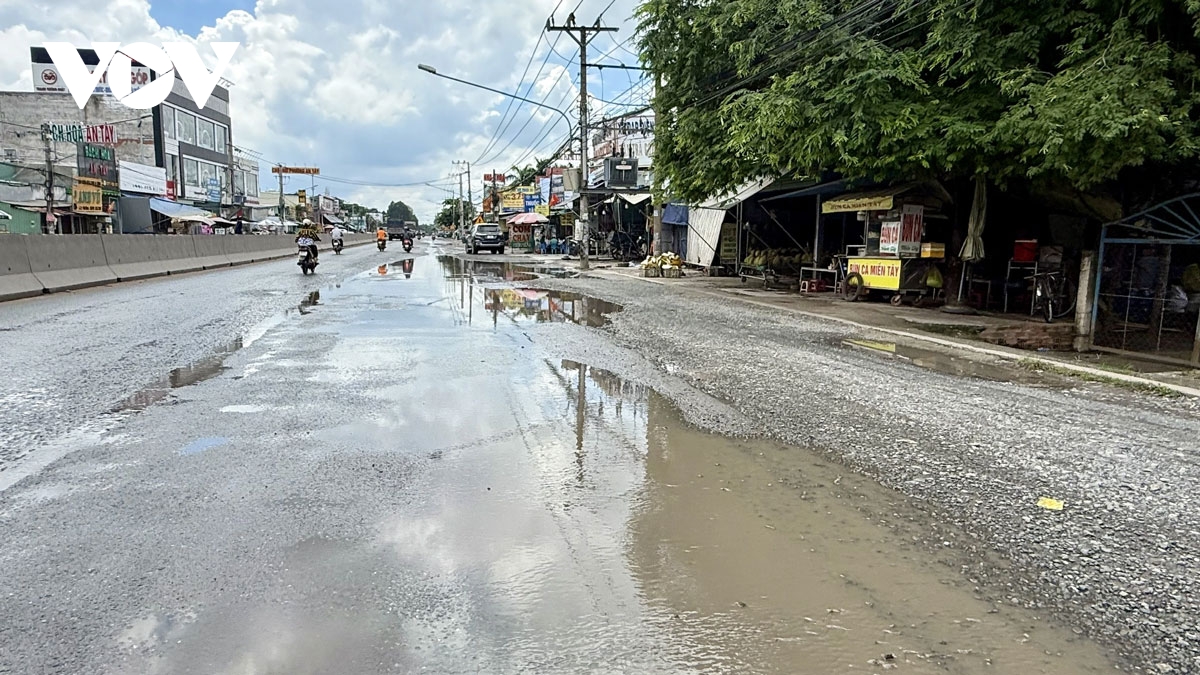 Đường ĐT 744 có nhiều đoạn hư hỏng nặng nhưng chờ mặt bằng nên vẫn chưa thể triển khai. (Ảnh: Thiên Lý)