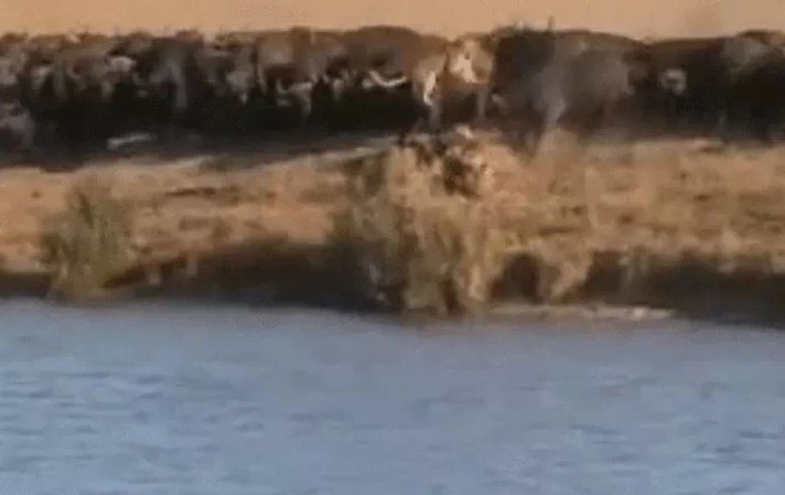 Lợi dụng thời điểm con trâu con bị thương, đàn sư tử liền nhảy xuống nước, cố kéo con mồi lên bờ. Tuy nhiên, ngay khi chúng tưởng chừng đã có được bữa ăn ngon, mặt đất bất ngờ rung chuyển bởi tiếng chân của hàng trăm con trâu rừng đang ồ ạt kéo đến giải cứu đồng loại.