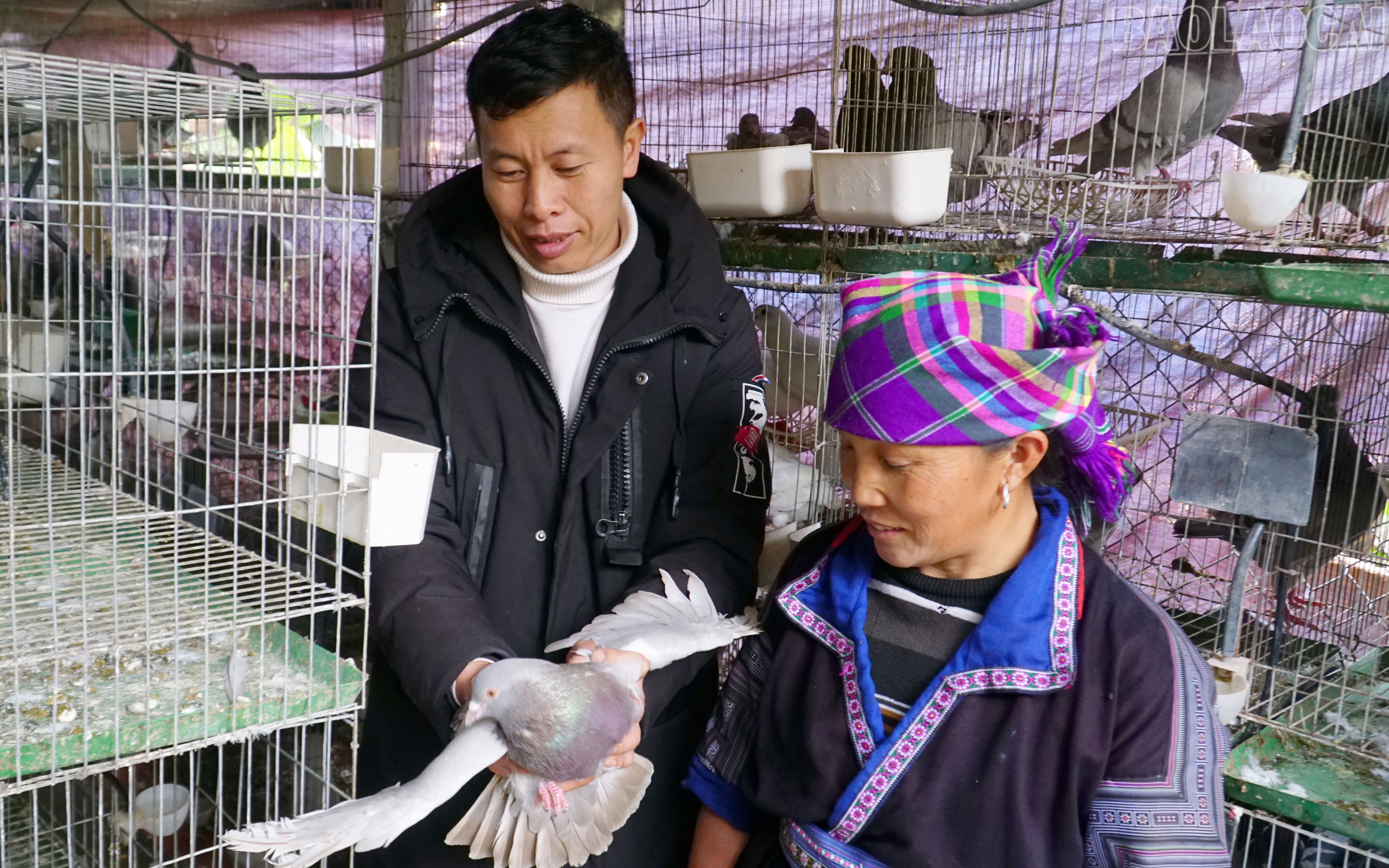 Cán bộ xã Mù Cang Chải (người bên trái) thăm mô hình nuôi chim bồ câu Pháp đem lại hiệu quả kinh tế cao của gia đình anh Hờ A Chống, thôn Chống Tông.